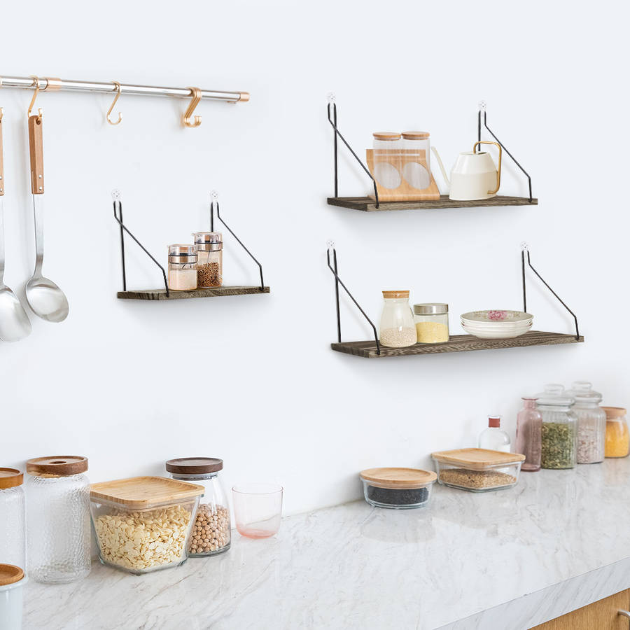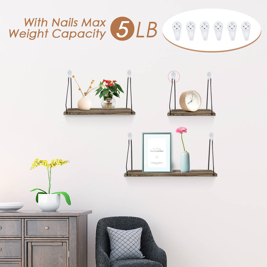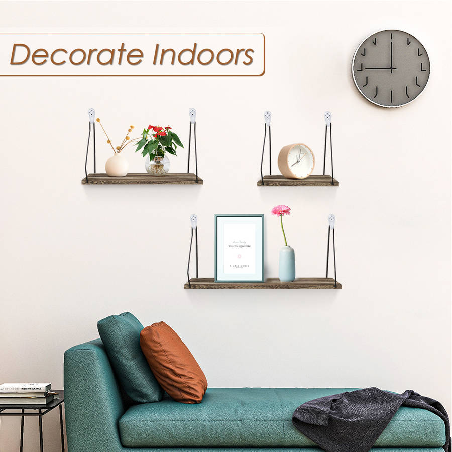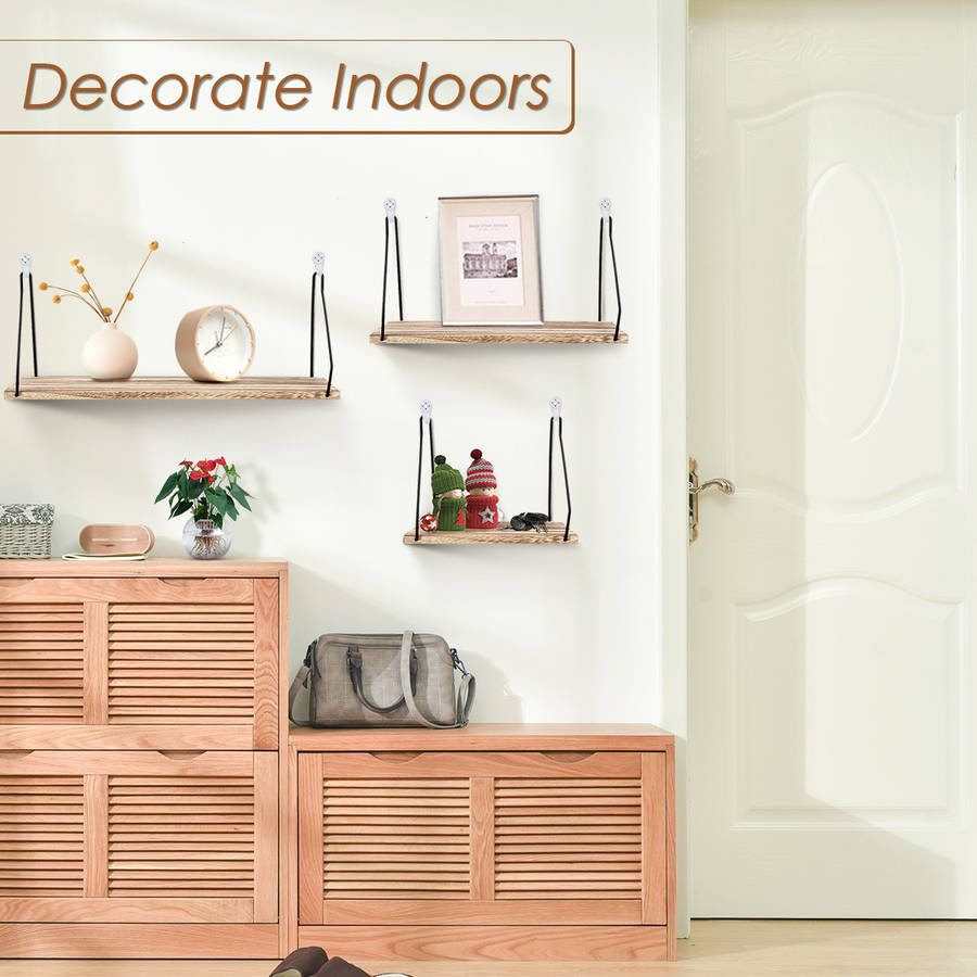 Features: Country Rustic Wall Shelves:Perfect for storing and displaying, it will bring a bit of country rustic style and sensible organization to your home with this beautiful wall wood shelf.Countryside style wood boards and modern black metal brackets.Simply decorate empty wall space above desk, fireplace, entryway, between windows. Set of 3 Storage Shelves: Large 43x 15x 17cm/17x 6 x 6.7, medium: 33 x 15 x 17cm/13 x 6 x 6.7, small: 22.5 x 15 x17cm/9x 6x 6.7.These hanging shelves can be used as storage shelves, wall display standing shelves.Our wall mounted shelf can be backdrop to decorate your bedroom,bathroom and kitchen.Simple and convenient design floating shelves make your home become tidy and fashion. Really light weight and easy to assemble wall hanging shelf. Sturdy and Easy to Install:We provided all the mounting accessories and you can just follow the instruction and mount this shelf in a minute.Gross Weight : 690g.Once putting up, each shelf can hold up to max 30lb and tested by durability.A flat surface provides a perfect platform for storage and display, while a 6 wide wood board helps keep the shelfas contents secure.Constructed of beautiful wood with black metal frame.Tired of a usual wall Come and take this floating wood shelf to home. Multifunction:Multi-purpose display shelves for products, collectibles, small plants, toys, jewelry, frames, Christmas decor, spice jars,display photo frame, vase, book, salt bottle and more ,Great for bathroom,bedroom, living room, office, kitchen.