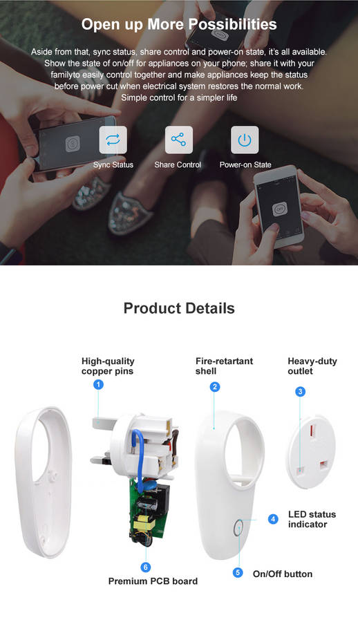 Sonoff S26 is a WiFi smart plug withUS/ UK/AU/ DE/ FR/ BR/ CH/ IL /ITstandard. Users can instantlyconvert any plug into a smart outlet with a convenient timer function that works on user`s smartphone. With thissmartsocket, you can turn on/off any connected device either on the APP eWeLink or by pressing the manual control knob of the WiFi plug. It allows you to set countdown/schedule/loop timers to auto-turn on/off the WiFi controlled outlet on App. You can share the WiFi plug with your family so that you can control together. Just plug and take a minute to setup, you`ll be able to control your lighting and home appliances from anywhere at any time.