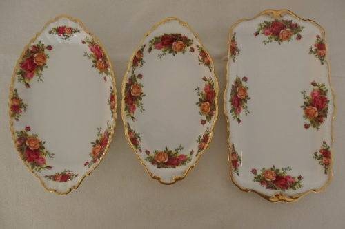 THESE THREE INCREDIBLE ROYAL ALBERT "OLD COUNTRY ROSES" SERIES FINE BONE CHINA AFTERNOON TEA/ PASTRY PLATES/ SANDWICH PLATES ARE IN PRISTINE CONDITION AND MEASURE AS FOLLOWS": THE RECTANGULAR SANDWICH PLATE IS 295mm LONG x 170mm WIDE AND THE TWO OVAL PLATES ARE 255mm x 145mm AND 270mm x 160mm RESPECTIVELY. THERE ARE ABSOLUTELY NO CHIPS OR CRACKS IN THE PORCELAIN AND THE GILDING IS STILL IS FANTASTIC CONDITION. THE OLD COUNTRY ROSES SERIES WAS RELEASED IN 1962 AND IS A CURRENT PATTERN, SO BUILDING UP A COLLECTION WOULD BE EASY. THE PATTERN CONSISTS OF A 3 ROSE DESIGN (PINK, RED AND YELLOW) SET ON CRISP WHITE PORCELAIN AND FINISHED WITH 22ct GOLD GILDED EDGES AND DETAILING.