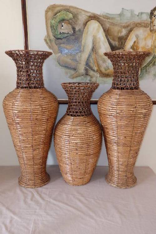 THESE THREE ABSOLUTELY SPECTACULAR LARGE WICKER URN SHAPED VASES WITH STEEL REINFORCED FRAMES ARE IN FANTASTIC CONDITION. THE VASES WOULD LOOK AMAZING IN A CORNER AS DECORATIVE FEATURE PIECES OR ON A LARGE SERVER WITH PAMPAS GRASS OR THE LIKES. THE TWO TALLER VASES ARE 780mm TALL (78cm) AND THE SMALLER VASE IS 605mm TALL (60.5cm). THESE ARE REALLY WELL MADE AND VERY EXPENSIVE PIECES. PLEASE VIEW THE PICS CAREFULLY TO FULLY APPRECIATE HOW STUNNING THESE LARGE VASES ARE AND TO CONFIRM THE CONDITION.