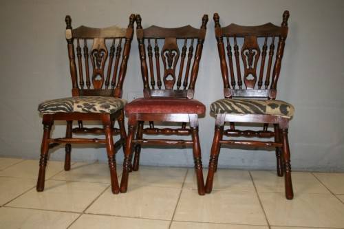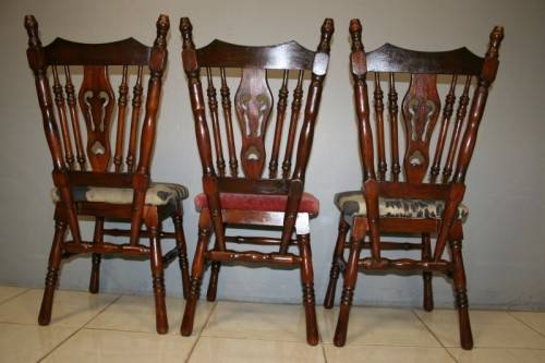 These three, fabulous dining room chairs with amazing carved detail on the back rests are in great condition with minimal age-related wear and tear. They are sturdy on the floor and would look awesome in your dining room or even in a bar area. The chairs each measure roughly 40cm long x 40.5cm wide x 102cm high. Please view the pics carefully to fully appreciate these awesome dining chairs and to confirm the condition.