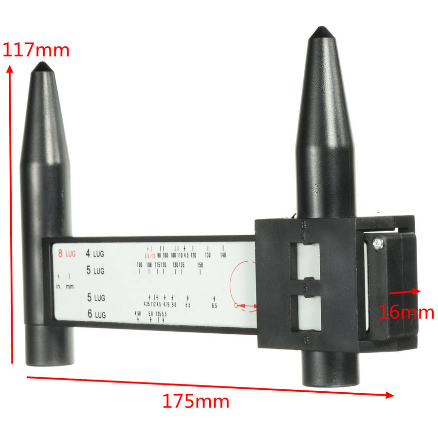 Features: 1.100% Brand new and high quality. 2.Can be used to measure a wheel or turned over to measure studs on a vehicle. 3.Measures most common 4, 5, 6 and 8 lug bolt patterns including: 4-Lug (4.25" to 5.5" & 98mm to 140mm) 5-Lug (4.5" to 5.5" & 100mm to 150mm) 6-Lug (4.5" to 5.5" & 114mm to 140mm) 8-Lug (6.5" & 170mm)