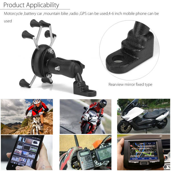 Description: Rearview mirror fixed types holder 4-6 inches mobile phone,radio, GPS can be used Applicable models:motorcycle, battery car, mountain bike and so on