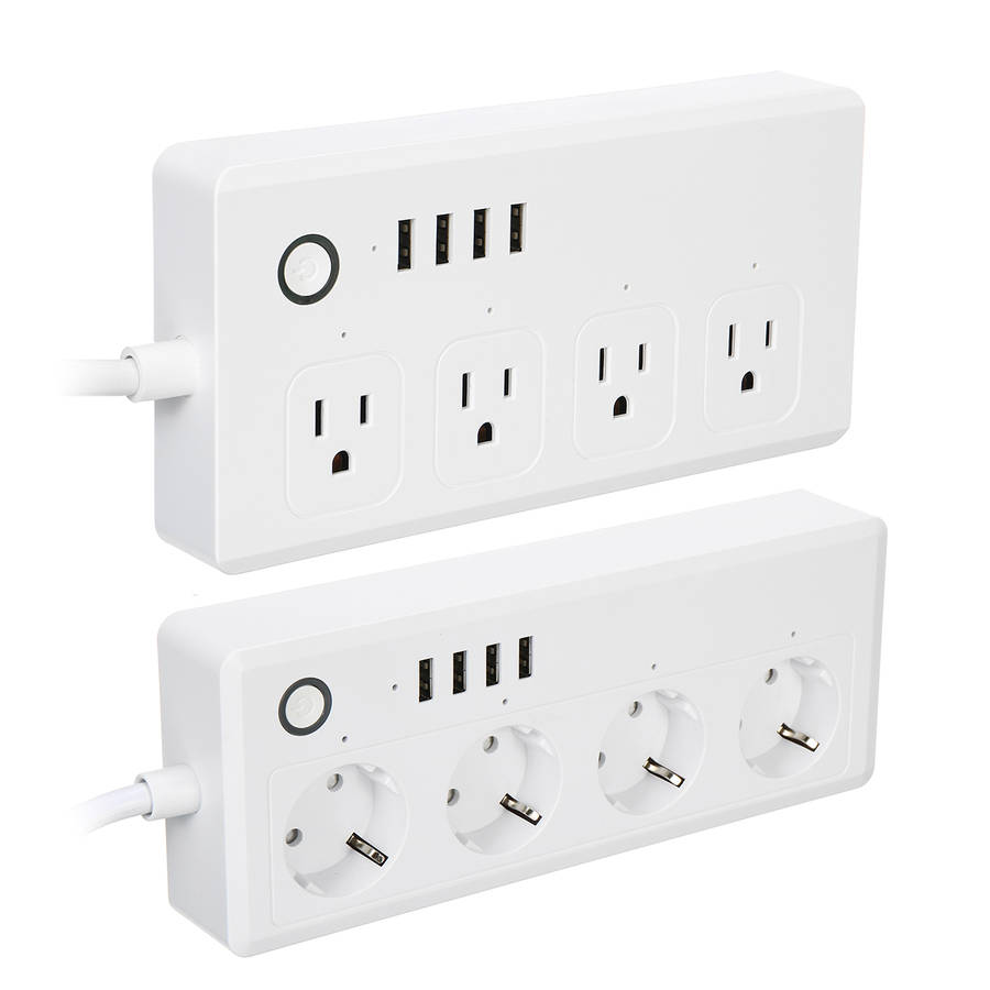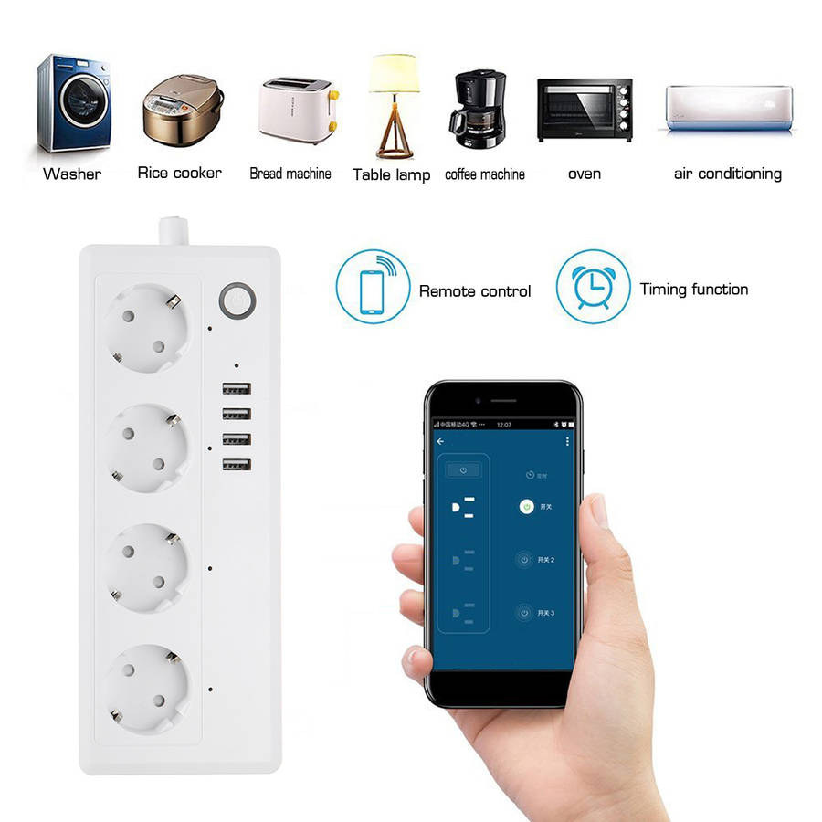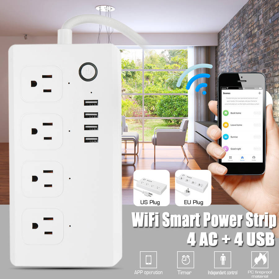 Features: - Mobile app remote control on and off - Timing function - Countdown - Support Alexa, google home, IFTTT voice control - Support multiple mobile phone control - Energy saving and environmental protection - Overload protection - App online upgrade - Can be added in bulk - Group control - AC and USB can be controlled independently (USB is a whole control) Specification: Input voltage: 100-240V Output current: 10A (15A needs to be customized) Shell: ABS + PC fireproof material Type: 4 AC + 4 USB Plug: US Plug, EU Plug Net weight: 0.43KG Certification: FCC / ROSH color: White Working humidity: <80% Working temperature: -20 a??-+ 70 a?? wifi distance: 50 meters outdoors, up to 30 meters indoors (depending on building materials and structure) wifi type: 2.4GHZ 802.11b / g / n Network security level: WPA / WPA2 Package included: 1 x Smart Socket