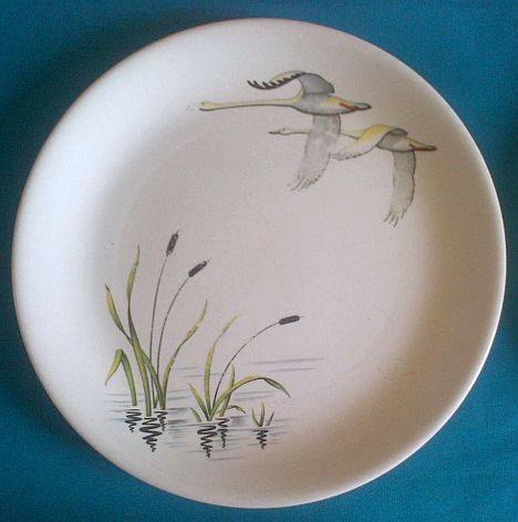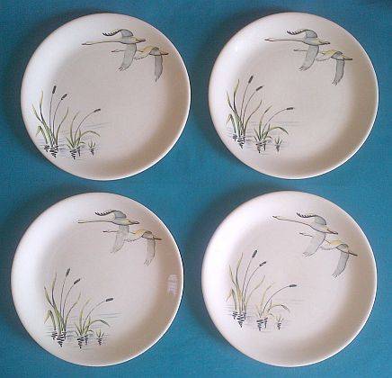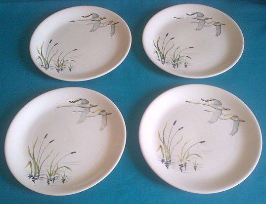 4 ALFRED MEAKIN ENGLAND "HOMING SWANS" PATTERN DINNER PLATES.
