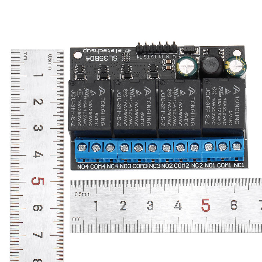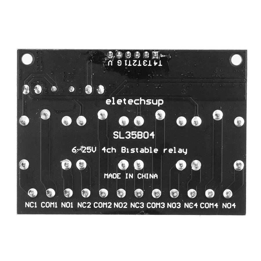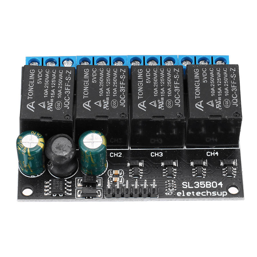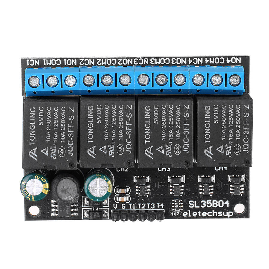 Feature: Working voltage: DC 6-24V (recommended DC 9V 12V 24V) Working current: 1 relay pulls in 37MA, 2 relays pulls in 73MA, 3 relays pulls in 110MA, 4 relays pulls in 146MA Quiescent working current: 2mA Relay load current: AC 250V/10A, DC 30V/10A Trigger mode: low level trigger Size: 65mm * 47mm * 18.5mm Weight: 56.8g Note: This is a self-locking (bistable) relay module. When triggered once, the relay is closed (and held), and triggered again, the relay is disconnected. Pin description: V: Positive power supply G: The negative pole of the power supply and the ground terminal of the trigger signal; T (T1/T2/T3/T4): Trigger signal input (0.2-2 second low pulse). NO: Relay normally open port COM: Relay common port NC: Relay normally closed port Instructions: When power is applied, the relay is disconnected. Click the trigger port (T1/T2/T3/T4 port) the relay to pull in (and hold), click the relay again to disconnect, and so on. Package includes: 1 x Relay module