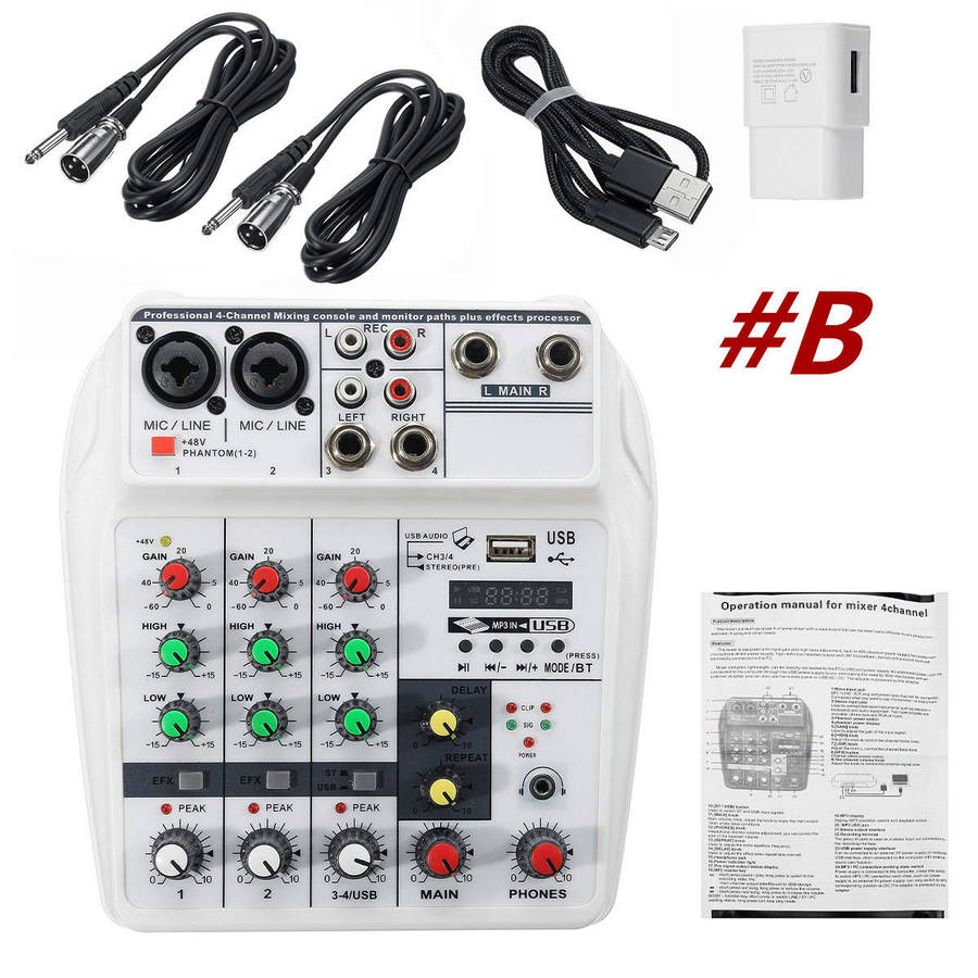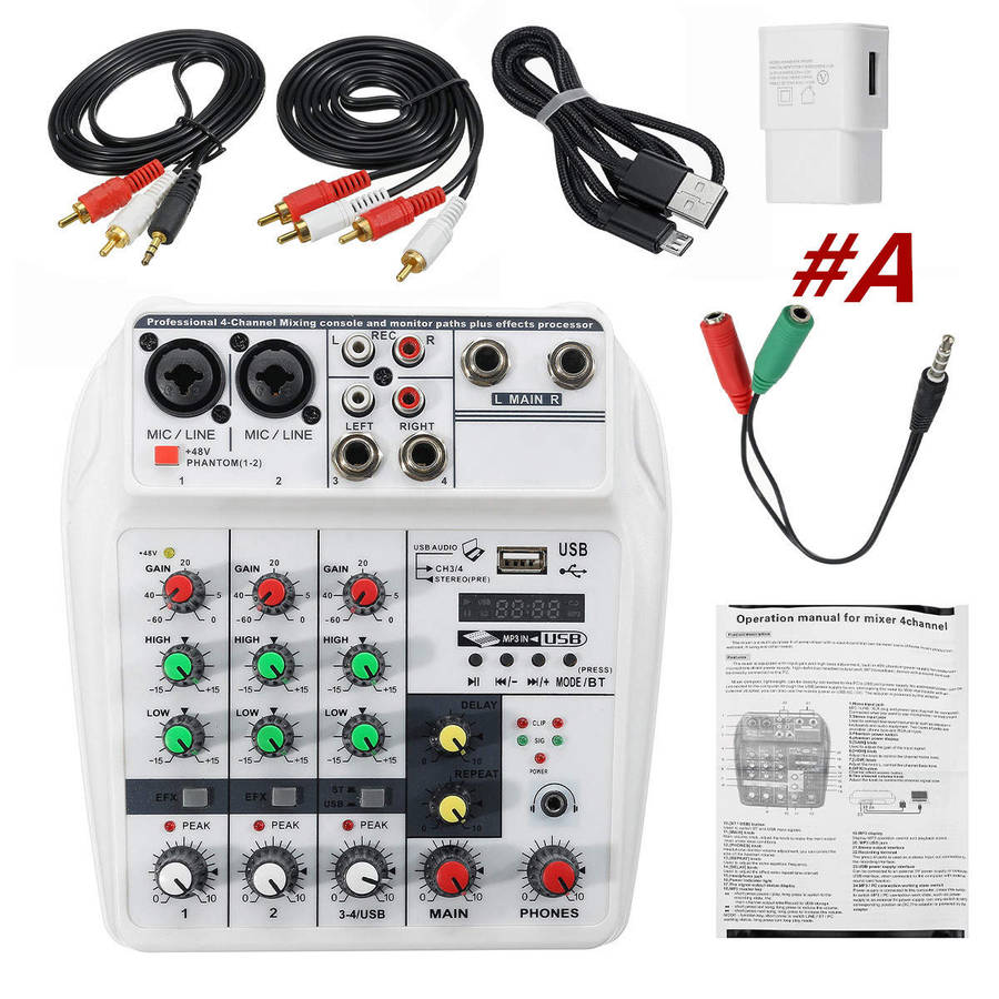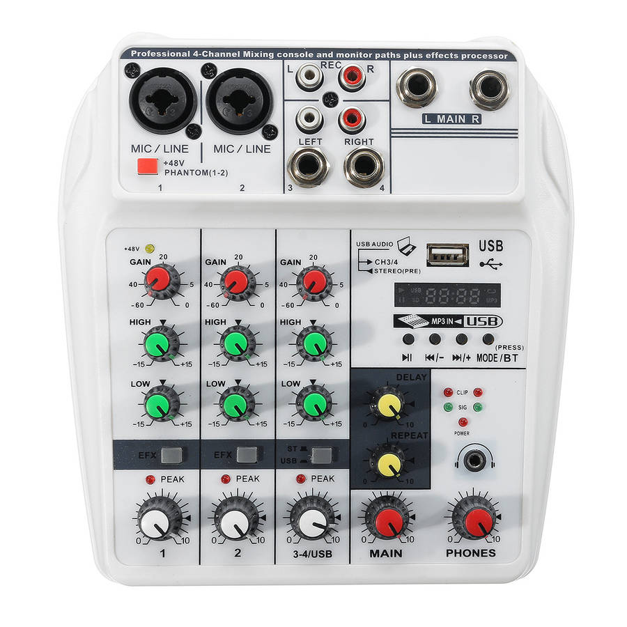 The mixer is a multi-purpose 4-channel mixer with a shound card that can be meet users of home music production, webcase, K song and other needs. The mixer is equipped with input gain and high bass adjustment, built-in 48V phantom power supply for condenser microphone direct power supply, high-definition headset output port, MP3 broadcast, device with a sound card can be directly connected to the PC. Mixer compact, lightweight, can be directly connected to the PC's USB port power supply. No additional power, can be connected to the computer through the usb power supply to run, eliminating the need for with the trouble with an external adapter, you can also use the mobile power or USB AC/DC. Multiple audio cable. 6.3/3.5/ lotus flower joints,have fine workmanship and stable transmission. Specification:
