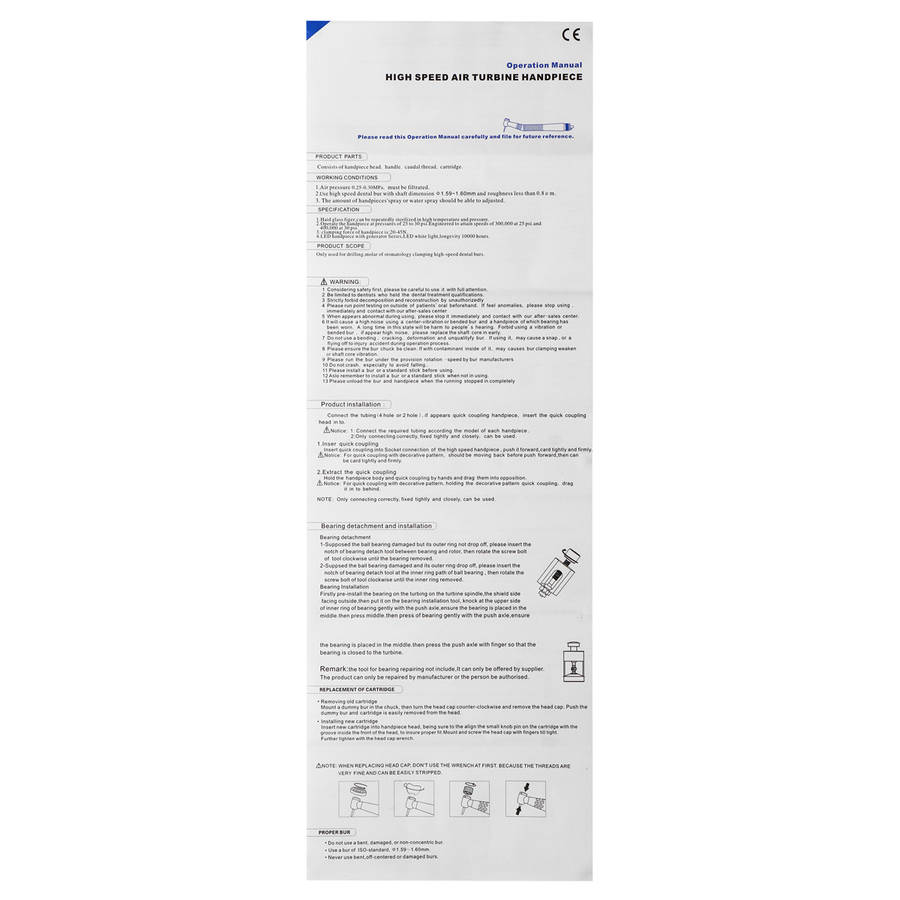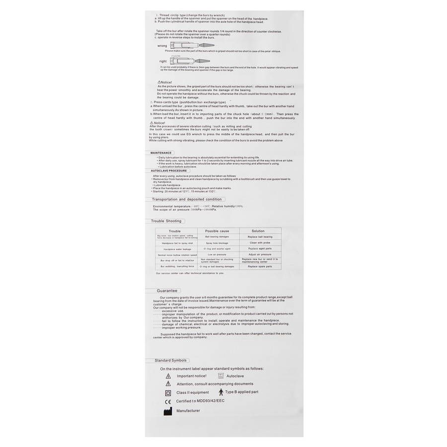 2.Operate the handpiece at pressures of 25 to 30 psi, Engineered to attain speeds of 300000 at 25 psi and 400000 at 30 psi.