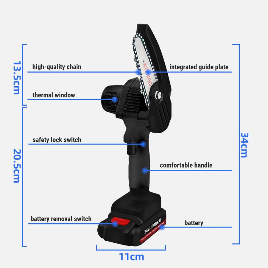 Item Specifics: Color: Black/Green/Red Power: 550W? Guide length: 4 inch Motor voltage: 21-24V Chain speed: 5m/s Size: (H)34cm/13.38 in Rotating Speed: 3000r/min? Chain Material: High Carbon Steel?