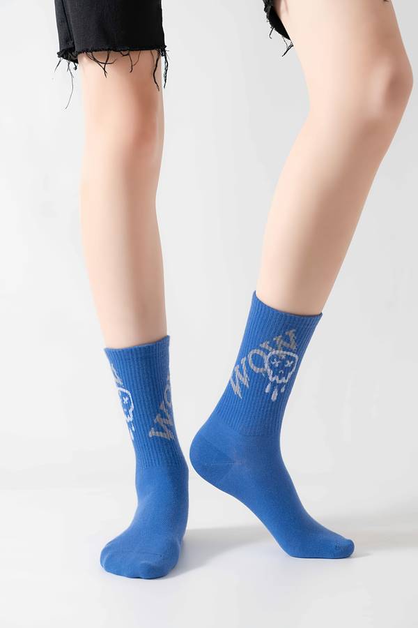 4 Pairs Of Blue Socks With White Letters One Size Men's Women's Mid Calf Cotton Socks Soft Breathable Fabric Trendy Gra Pattern:Alphabets Operation Instruction:Hand wash or professional dry clean Composition:80% Cotton,17% Polyester,3% Spandex Weaving Method:Knit Fabric Material:Cotton Other Material:Polyester