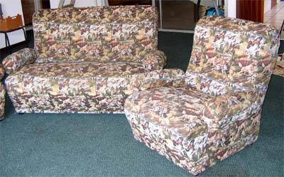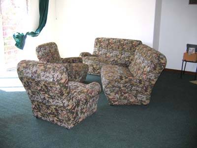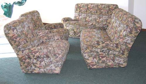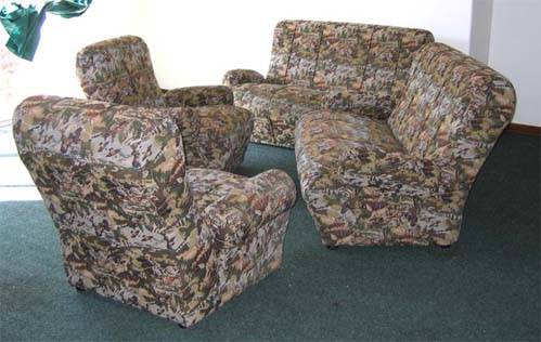 Fabric lovely designer lounge suite , is 6 seat - 2 single seat, each sit measure approx. 92 cm x 86cm H x 84 cm deep and 2 double seat, is approx. 153 cm wide x 86 cm high x 84 cm deep in good condition [ one spring is lose on a double seat, can be fix not a major problem ] same as photo.