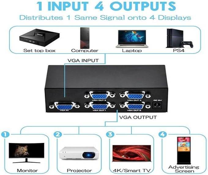 The 4 Port 200MHz VGA Splitter is essential for distributing VGA signals to multiple displays simultaneously in professional environments such as trading floors, classrooms, and conference rooms. Its high-resolution support and plug-and-play design ensure easy setup without additional software, making it ideal for integrating into existing setups. With robust construction and efficient signal transmission, this splitter offers a cost-effective solution for expanding display capabilities while maintaining high-quality visuals across connected monitors. Perfect for business presentations, education, or digital signage, it enhances multimedia experiences with reliable performance.