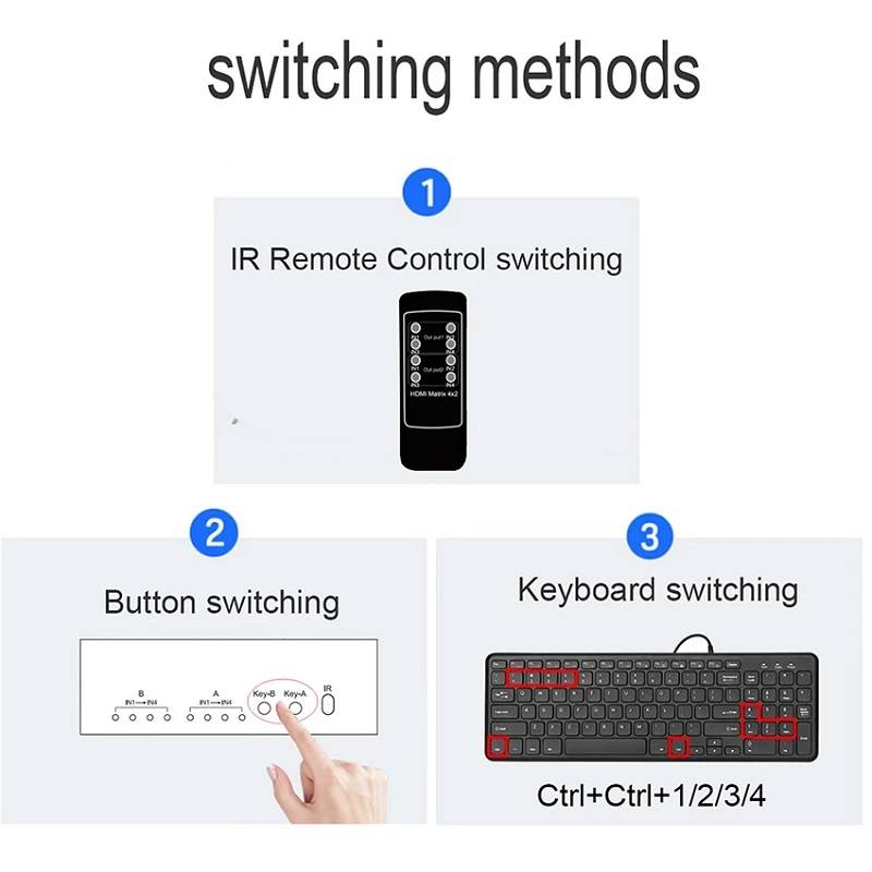 Support 3 switching methods: key switch, remote control switch, keyboard switch.