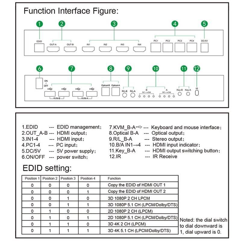 1.This HDMI 4X2 KVM matrix, it can switch between 4 input signal source devices, and distribute the signal to 2 monitors (2 monitors can display the same picture or different pictures) and any one output All ports can realize independent audio output through Optical SPDIF or 3.5mm audio jack.