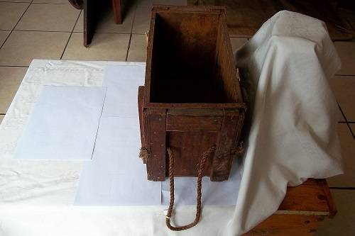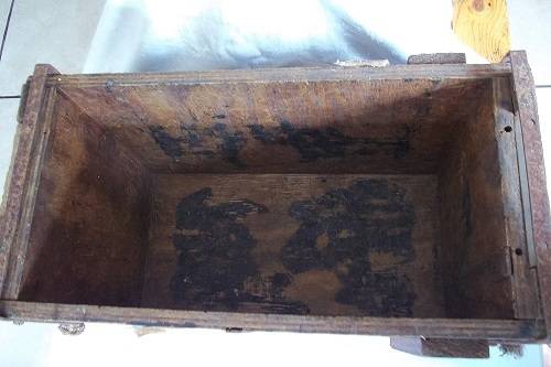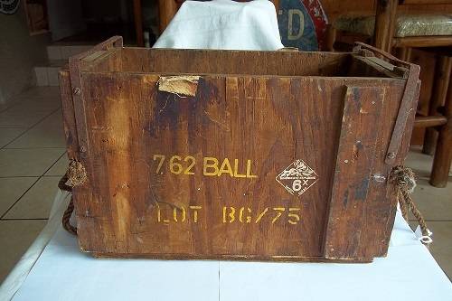 A wooden 7.62 Ball ammunition box. It was issued on 10/7/1976 and has Government Explosive marked on it. It measures 42cm x 28cm x 23cm, and is in fair condition for its age - missing the lid.