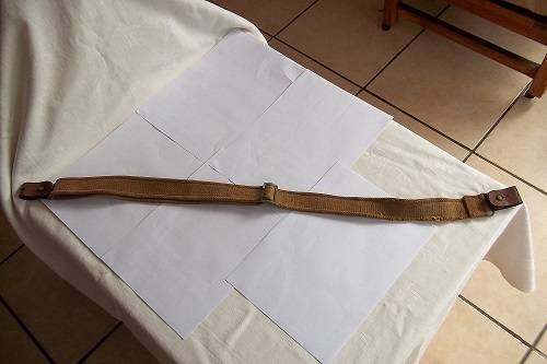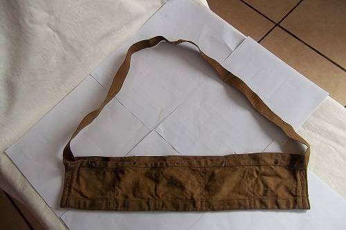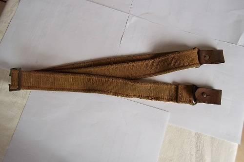 Vintage Lee Enfield rifle belt. I think that this is a Lee Enfield rifle belt dating to the 1940s. It is manufactured from thick canvas, and has leather fasteners on the ends. It has some wear, but is generally in good condition for its age.
