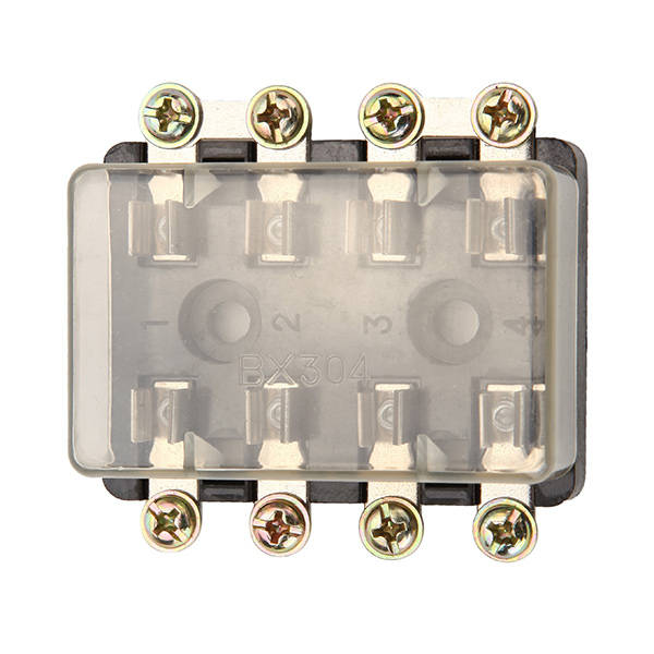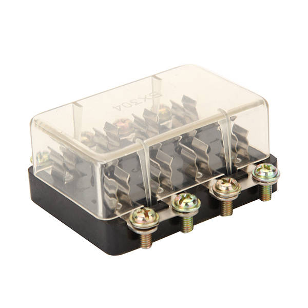 Automotive fuse box, suitable for AGC & JSO Enable to hold 4 fuses. Universal for use in all vehicle Compact size, sturdy construction. Voltage:DC32VWith transparent cover for dust and moisture protection. Material: plastic & copper For fuse: AGC & JSO 4 in and 4 out Maximum load 20A/way Voltage:DC 32V Temperature range: -20 to 150Celsius