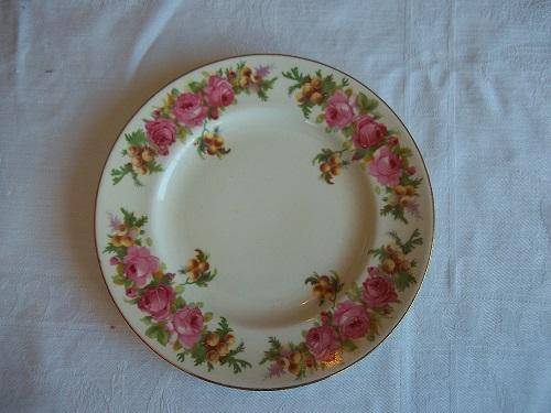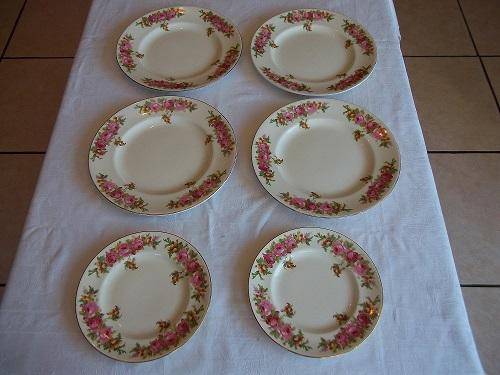4 x Royal Doulton Roses & Wattle starter/ fish plates and 2 side plates. This great old pattern was one of many designed by Royal Doulton expressly for the Australian market. The D5643 pattern number dates it to 1936. The 4 starter/fish plates are 21.5cm in diameter, and have no chips or cracks. / The 2 side plates measure 16cm in diameter, and have no chips or cracks. Lovely old items that would proudly adorn any dinner table.