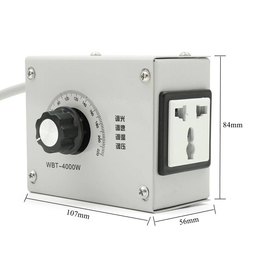 Input voltage: AC 220V ± 10% Output voltage: AC 0-220V ± 10% Control motor power: 0-4000W Efficiency (η): 95% Color: Ivory white Size:Approx.107*56*84mm/4.21*2.20*3.31"