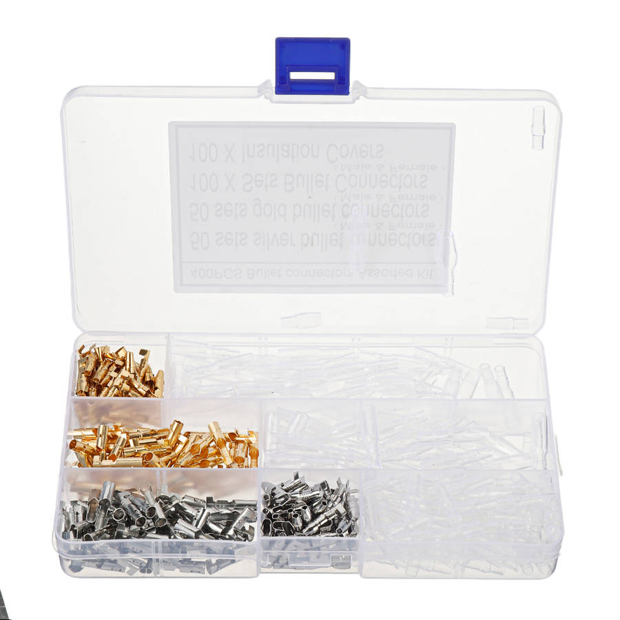Color: Silver, Gold (As Pictures Show) Material: Brass,Tin Dimensions : 3.9mm (Diameter) Storage Box dimensions:(L*W*H):17.5*10*2.3cm Quantity: in Total: 400pcs 50 Sets Silver Bullet connectors(Male&Female) 50 Sets Gold Bullet connectors(Male&Female)