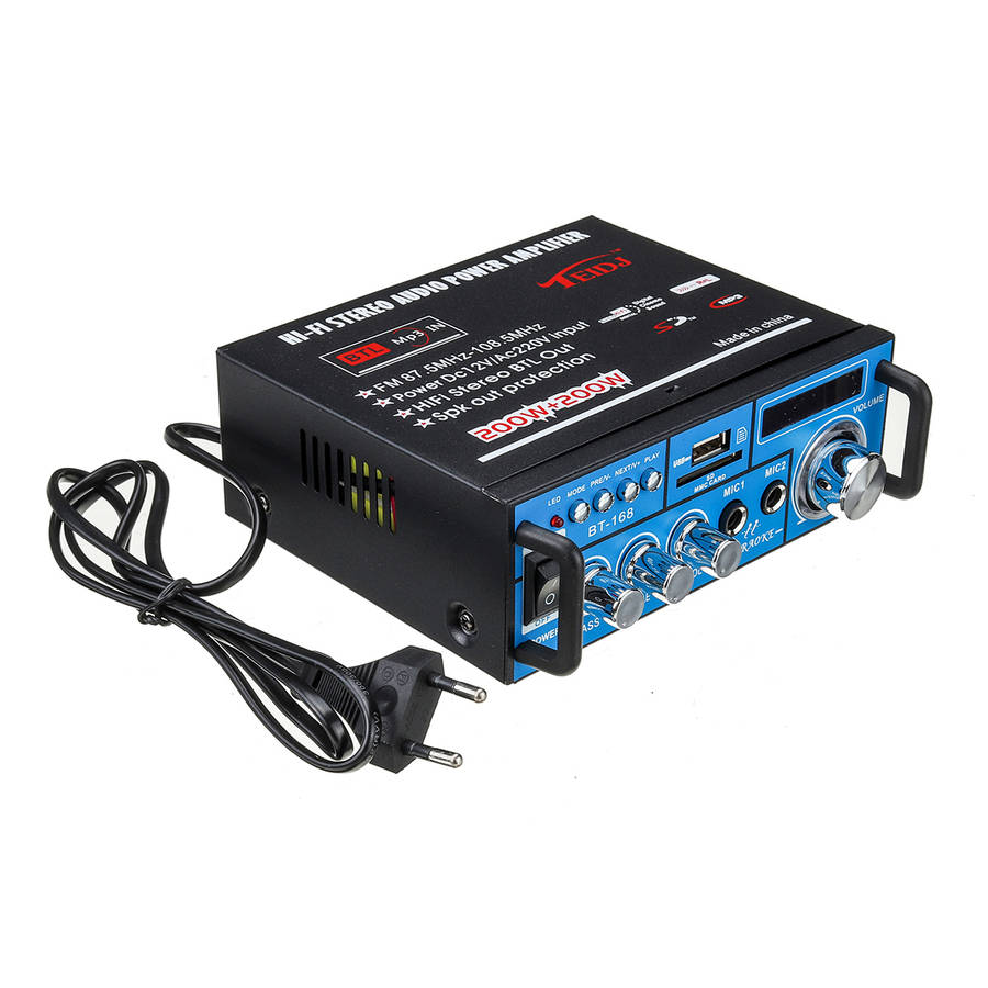 Features: -Mini HIFI digital Bluetooth audio power amplifier. -Built-in protection circuits. -Built-in LCD display, with backlight function. -SD Card, U disk, MP3 format play, support Bluetooth wireless connection. -Supports FM stereo radio. -Two microphone input slot, karaoke system in your home or in car. -With treble, bass, and volume control, very easy to use. -Low distortion supplies a clearer, stronger and more powerful sound. -Two main channel output. -With Remote control function. -DC/ AC power in, Suitable foe home or your car. Specifications: Colo: Black+Blue Size: Approx. 16x15x5.5cm / 6.3x5.9x2 inch Input voltage: AC 220V/ DC12V(in car) Plug: EU plug(sent with an adapter according to your country) Bluetooth: Support Peak power: 200W+200W Channel: 2 CH Load impedance: 4-8 SNR: >92 db FM frequency: 87.5-108MHz Distoration rate: 0.05% Frequency: 10Hz-20KHz Sensitivity: 0.25mV-220mV Note: 1.Please allow 1-3cm error due to manual measurement. Please make sure you do not mind before you bid. 2.The colors may have different as the difference display, please understan.