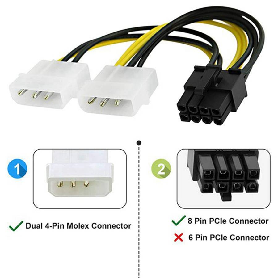 This double 4pin to 8pin cable makes a video card be able to connect with 2 power supplies, more practical to use.This PCI-E 4pin to 8pin adapter can solve the power shortage problem.This 4pin to 8pin power cable is suitable for many types of graphics cards and can provide good connection and performance.This PCI-E power adapter cable adopts the superior material to make and has a long lifespan, it is not easy to be damaged.This PCI-E adapter cable can withstand 180W of maximum power and is suitable for replacing the worn or damaged cable.Connector: 2x 4pin male, 1x 8pin femaleCable length: 18cmGauge: 18AWGPower: Max.180WColour: as shownMaterial: Copper+PVCSize: About: 20cmPackage Contents:40 * 8-Pin PCIe to Molex (2X) Power CableOnly the above package content, other products are not included.Note: Light shooting and different displays may cause the color of the item in the picture a little different from the real thing. The measurement allowed error is +/- 1-3cm.