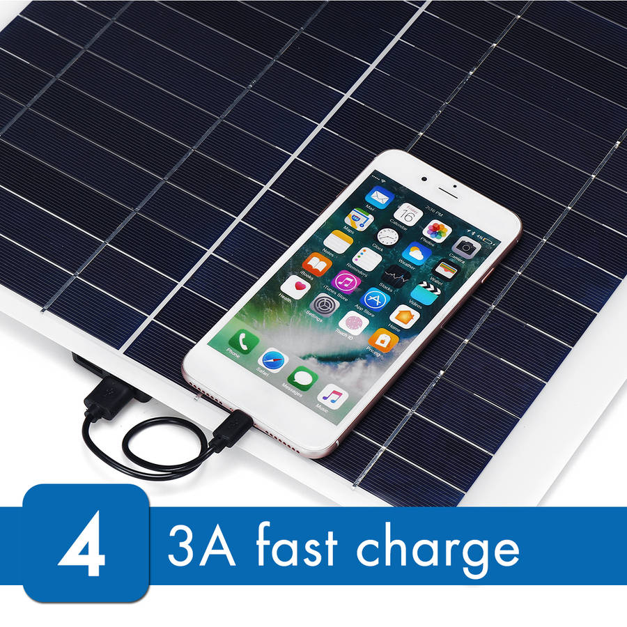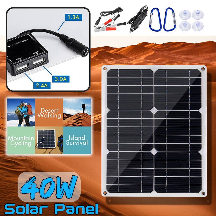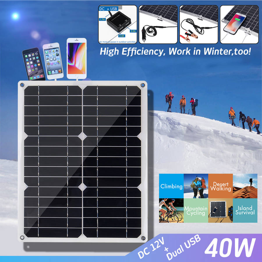40W 18V Mono Solar Panel Dual 12V/5V DC USB Monocrystaline Flexible Solar Charger For Car RV Boat Battery Charger EVA+PET at front panel, light-weight but durable. USB and DC output interface for more purpose.