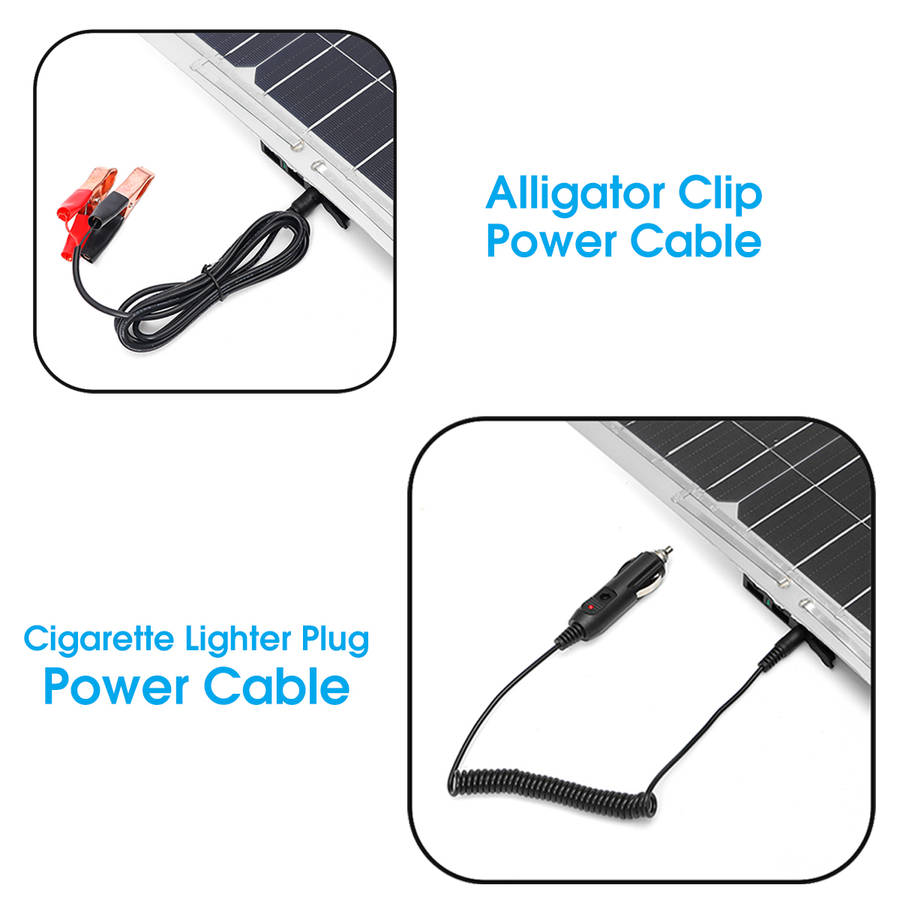 Package Include: 1x 40W Panel 2x Carabiners 4x Suckers 1x 12V Alli-gator Clip Power Cable 1x 12V Ciga-rette Lighter Plug Power Cable