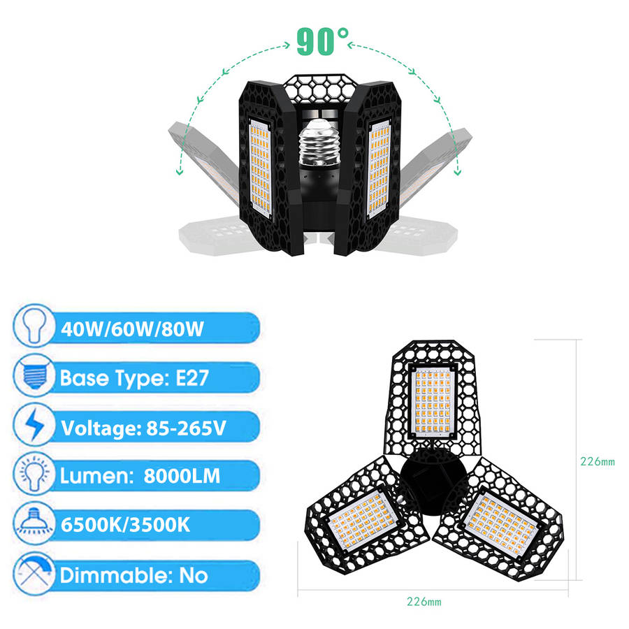 Specification: Socket: E27 Voltage: AC85-265V Power: 40W, 60W, 80W Light source: 2835LEDs Color temperature: warm white 3500K, white 6500K Luminous Flux: 8000LM Angle Adjustable: Yes Body Material: Plastic Open Size: Approx. 226*226mm