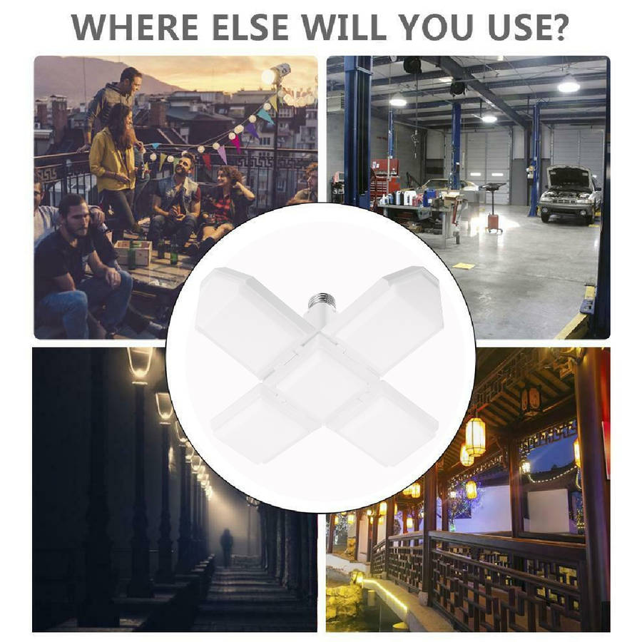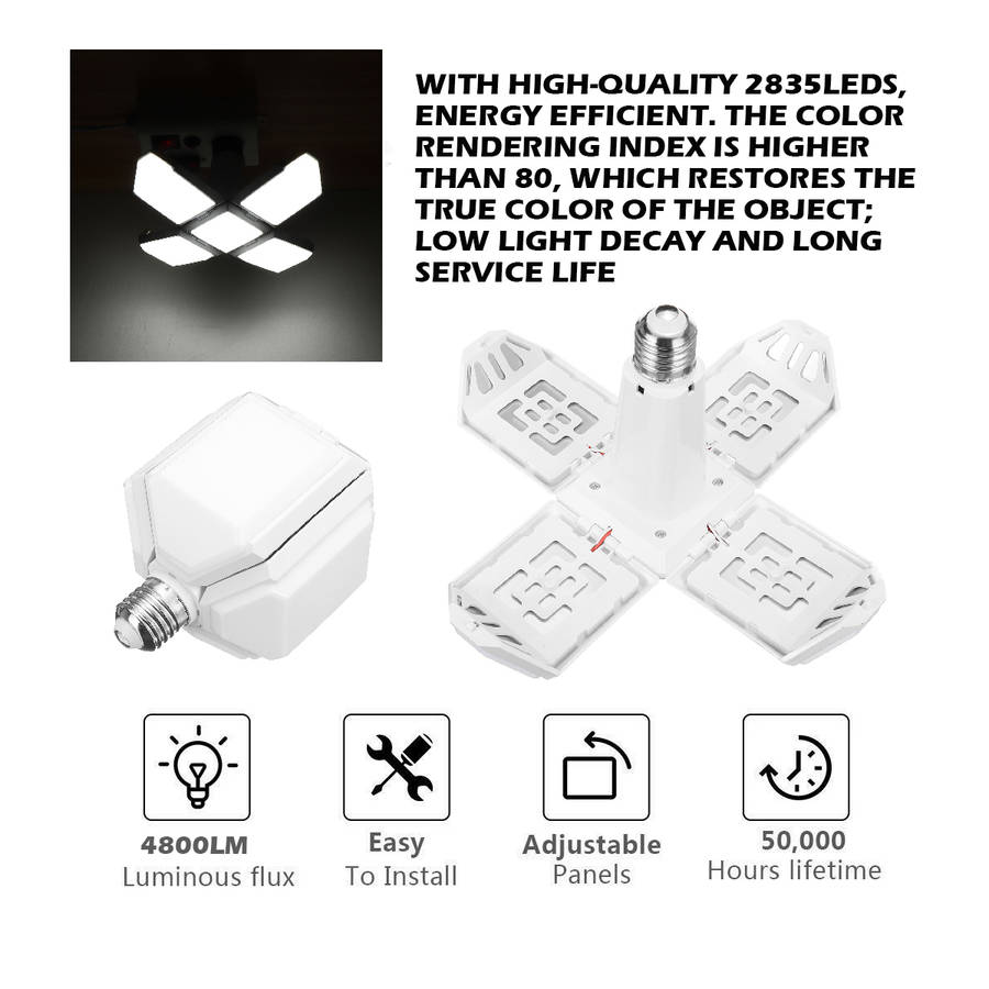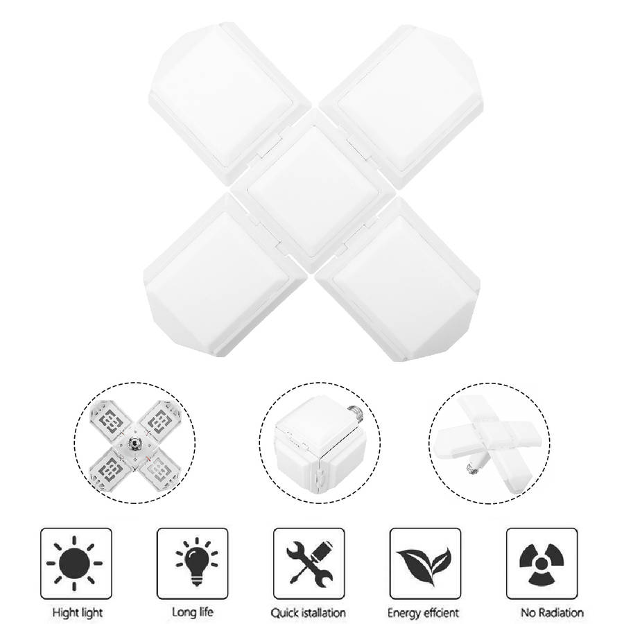 Features: Premium Material: It adopts high quality aluminum shell and PC lampshade , which is light in brightness, soft in light, stable and durable. Adjustable illumination Angle: Each illumination unit could be adjusted by 90 degrees so that the illumination angle and area can be adjusted at your request. This allows more effective light to reach your working area, and thus the high illumination efficiency of LED bulbs can be achieved. Energy Saving & Long Service Life: With high-quality 2835LEDs, energy efficient. The color rendering index is higher than 80, which restores the true color of the object; low light decay and long service life. Wide Application: Used as garage LED light, low/high ceiling lights, LED work lights or LED bulbs. A great alternative to traditional fluorescent lamps for garages, basements, shops, workshops, public facilities, recreation rooms, warehouses, barns, equipment rooms and other industrial work spaces with large area illumination. Universal E27 Lamp Holder: The universal E27 lamp head is used for easy installation and does not require any installation tools, saving time and effort.