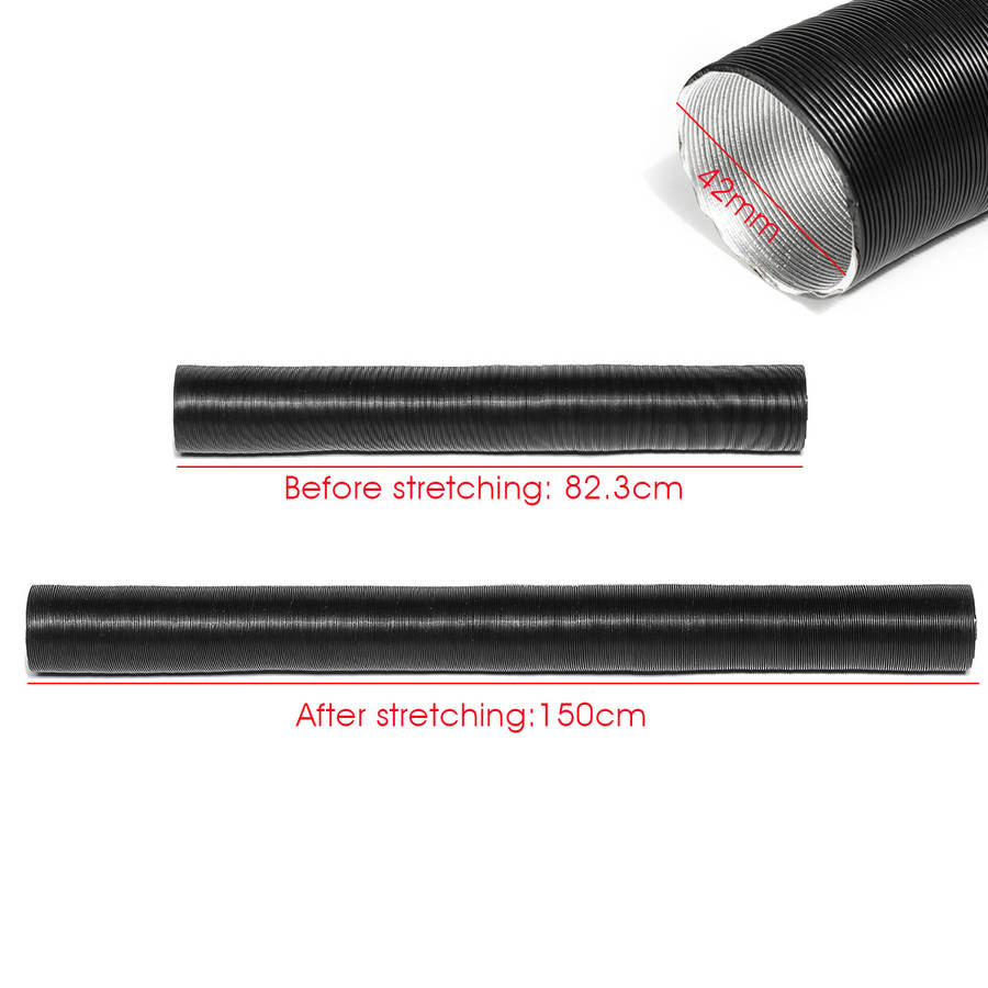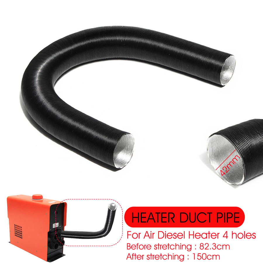 Specification : Product name : heater duct Material : Aluminum foil Color : black Diameter : 42mm/1.65in Before stretching : 82.3cm After stretching : 150cm Application : for Air Diesel Heater 5000W 4 Holes , Air paking heater/Car/Truck/Boat/Heavy machine /Agricultural machinery/industrial machinery etc.