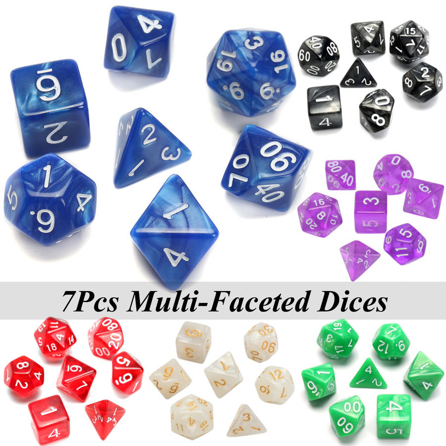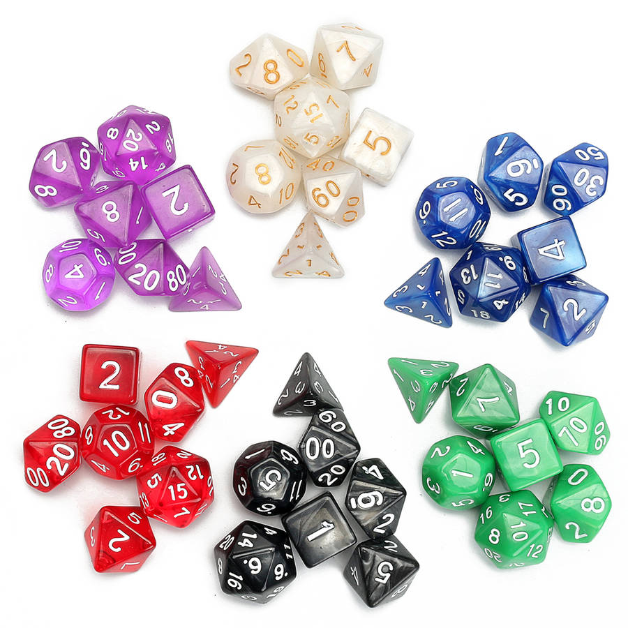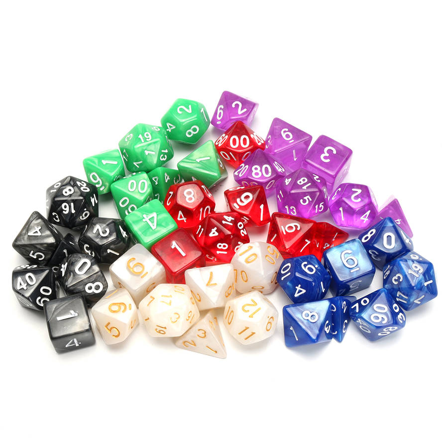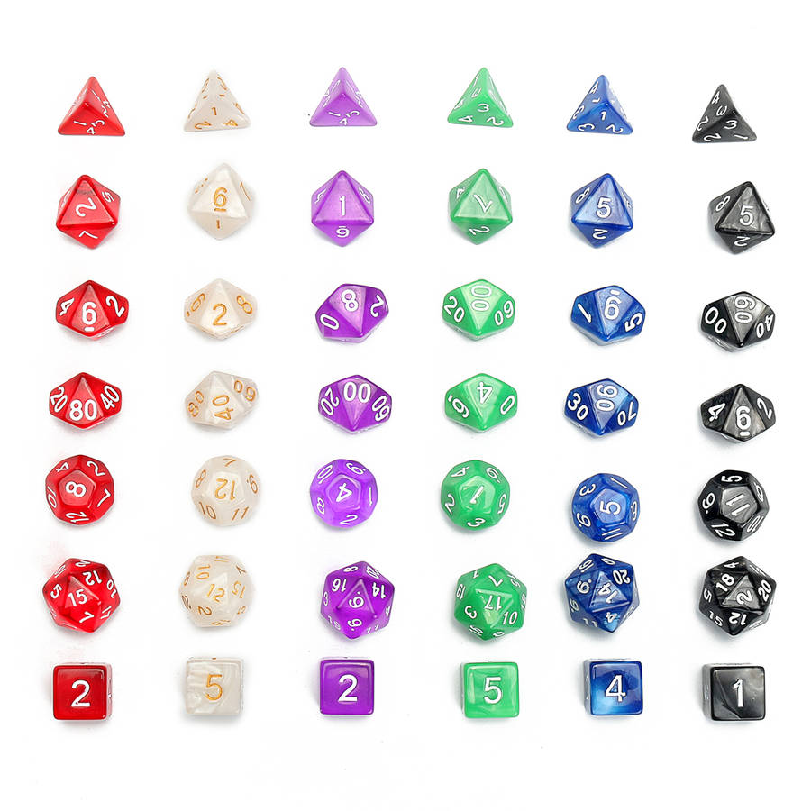 | *42 polyhedral dices in 6 complete sets, Each 7-die set contains one D20, one D12, two D10 (00-90 and 0-9), one D8, one D6, and one D4. |
