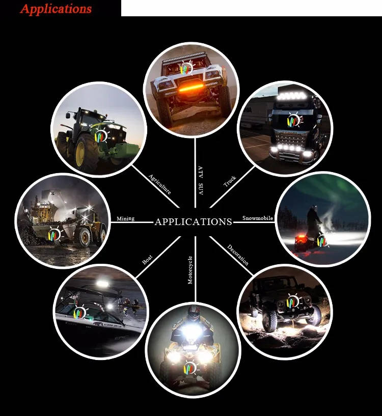 Use for Work light,Day light,fog light,driving light,working light lamps,vehicle's roof lights,vehicle's front lights,off road exterior lighting,