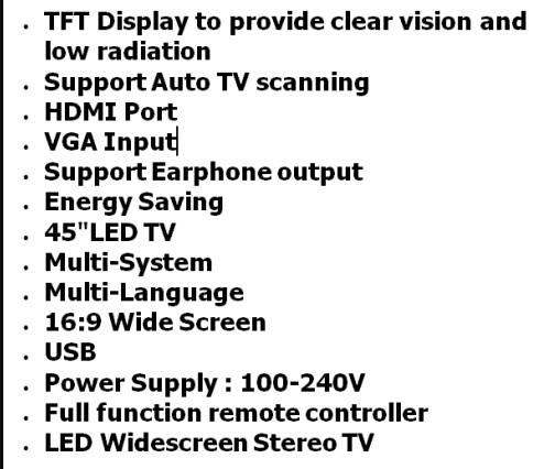 45 INCH LED TELEVISION / HDMI / AV / VGA / RF / - SUPERIOR LED COLOUR TECHNOLOGY