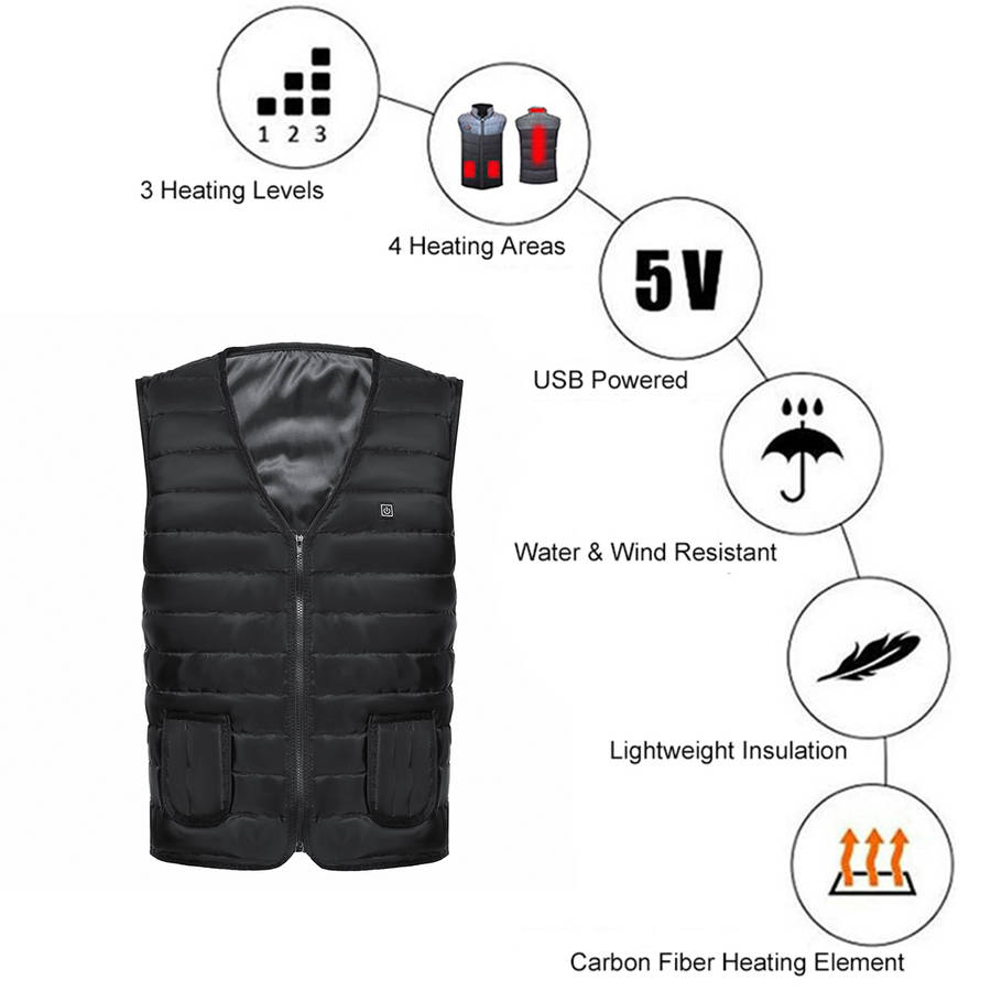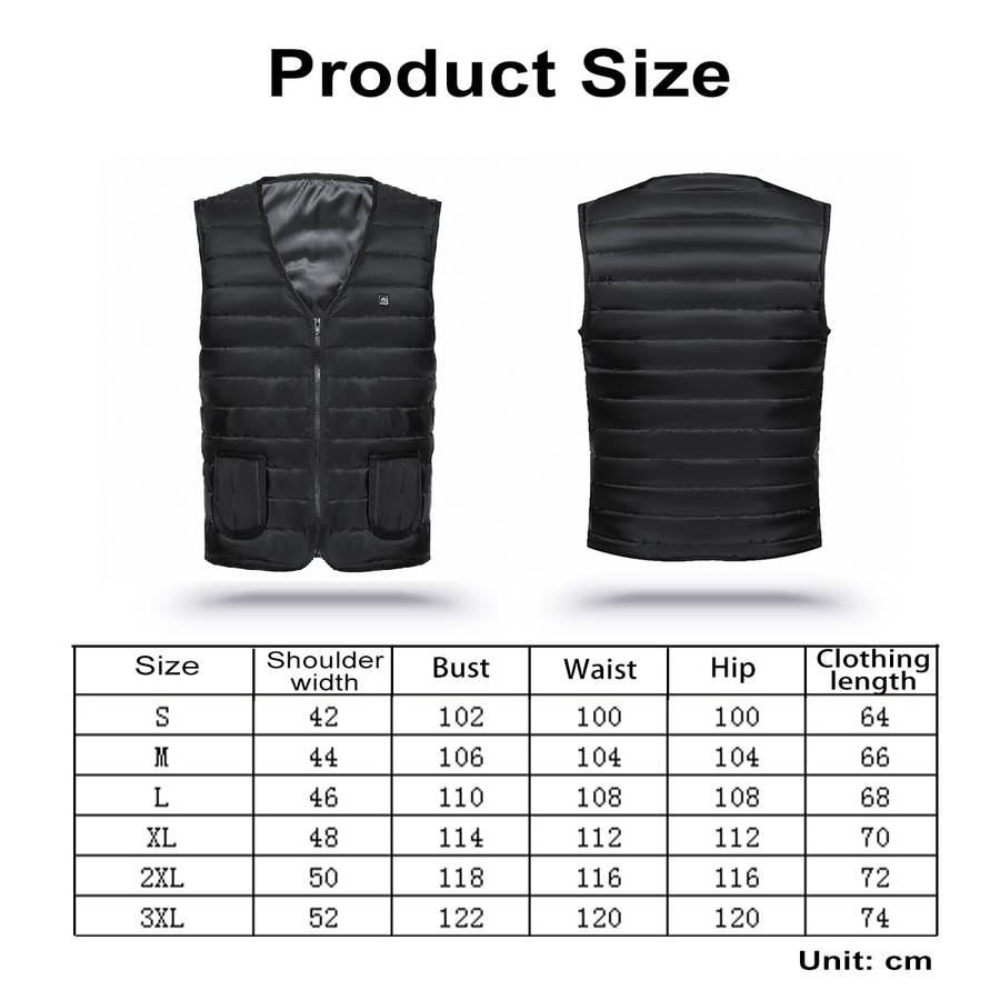 It can help you easily live through a whole winter without wearing bulky clothes under cold condition. ? Specification: Color: Black Suitable: Unisex Materials: Fleece Fabric + Polyester Size: S/M/L/XL/XXL/XXXL ? 3 Levels Temp Control: Highest (Warm): the temp is 45?ᆪC Medium (Comfortable): the temp is 35?ᆪC Lowest (Energy Saving): the temp is 25?ᆪC ? How to Clean the Heating Waistcoat?? Machine wash & hand wash are available. Do not wring or twist. Unplug the power before washing and make sure it is dried before heating. ? Note: 1. The heated Waistcoat USB plug is in the inner pocket, Plug it with power bank USB port ( Power bank is not include). 2. Don`t put on the heated Waistcoat without any underwear.