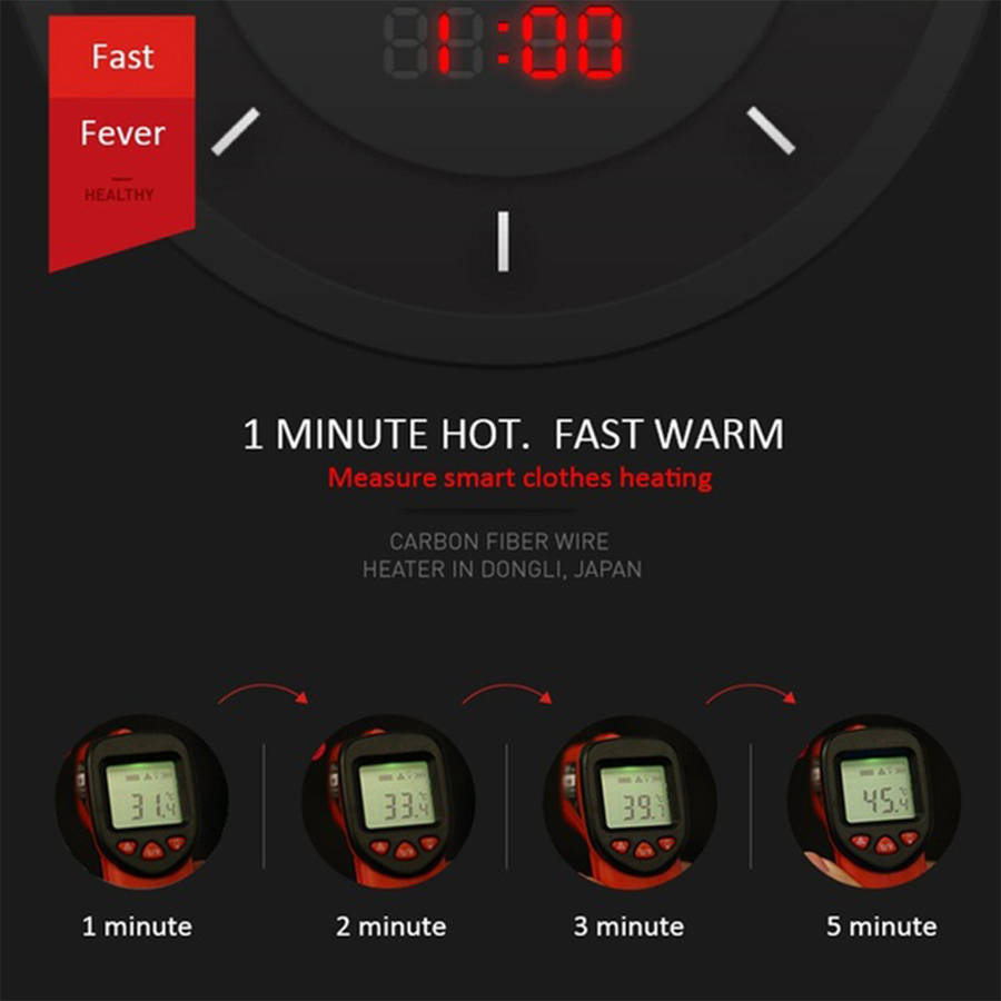 Description: 1.Four Heating Zones & 3 Heating Levels: 5 carbon fiber heating generate heat across core body areas (chest,waist,back and neck).
