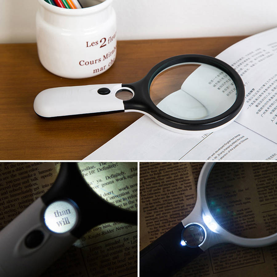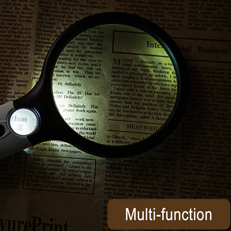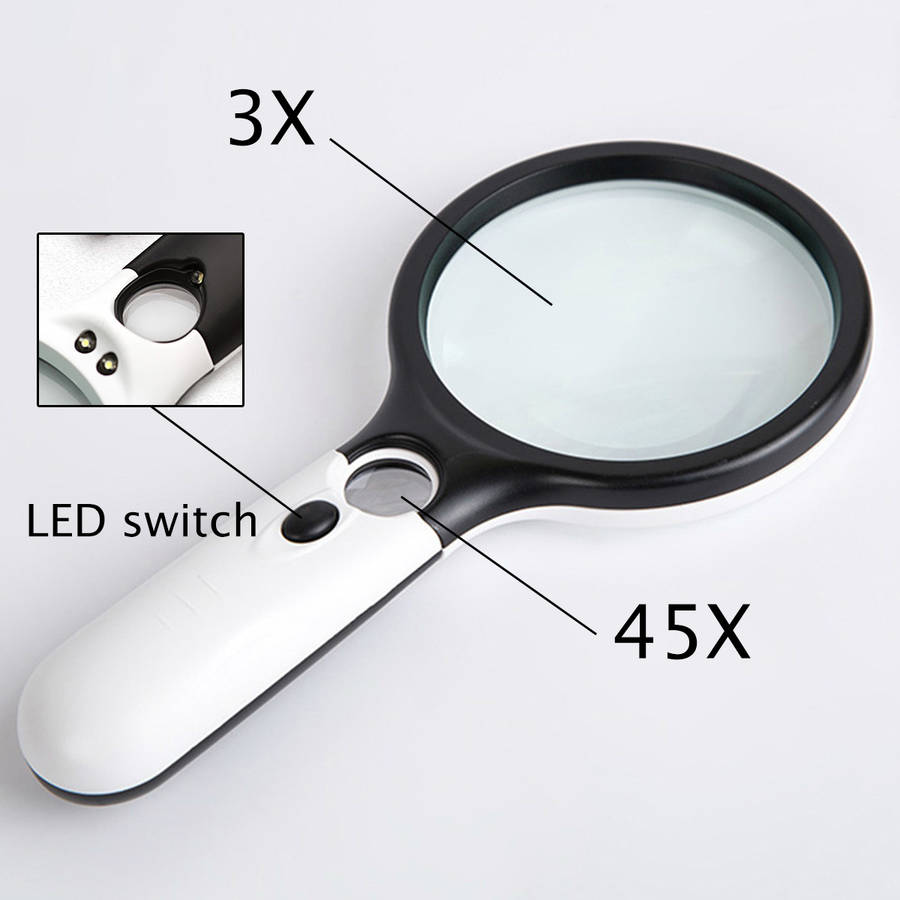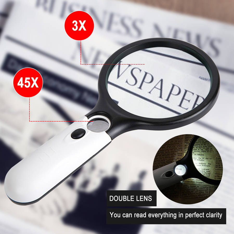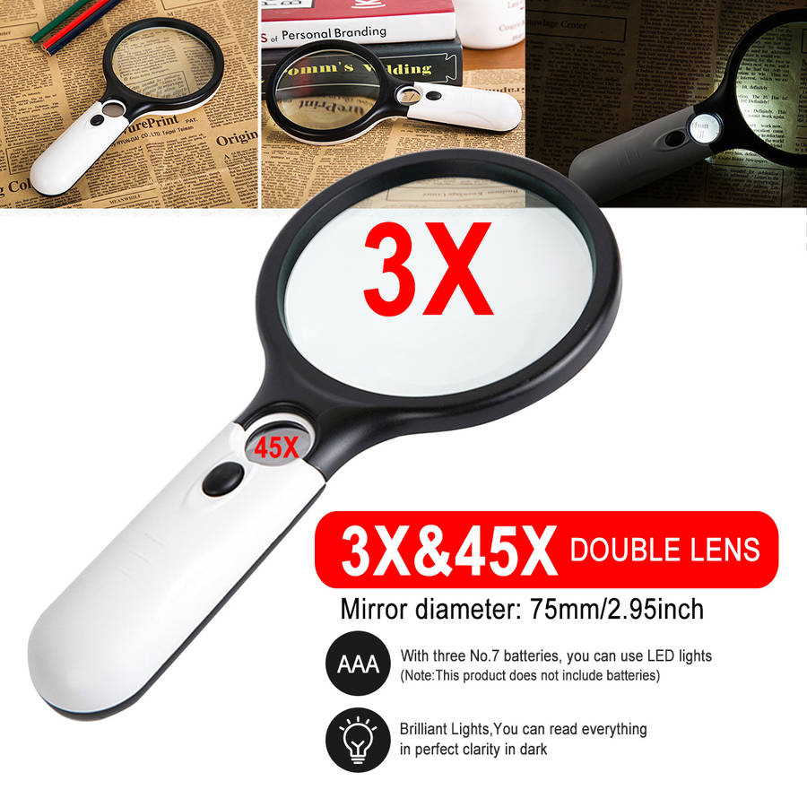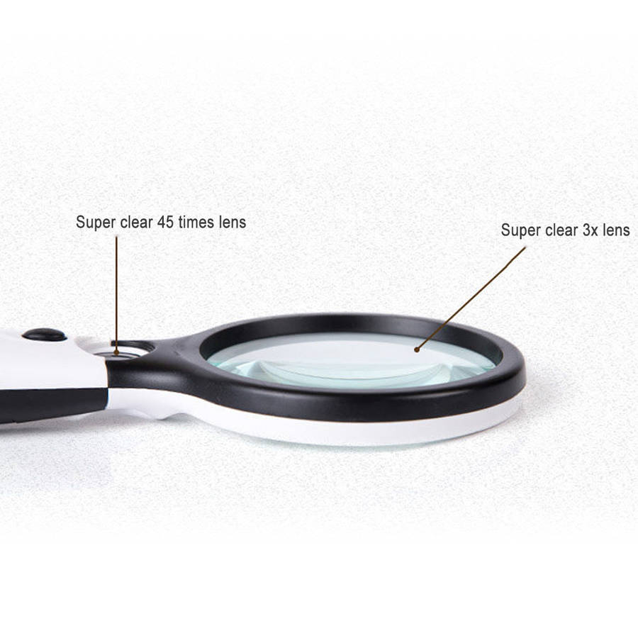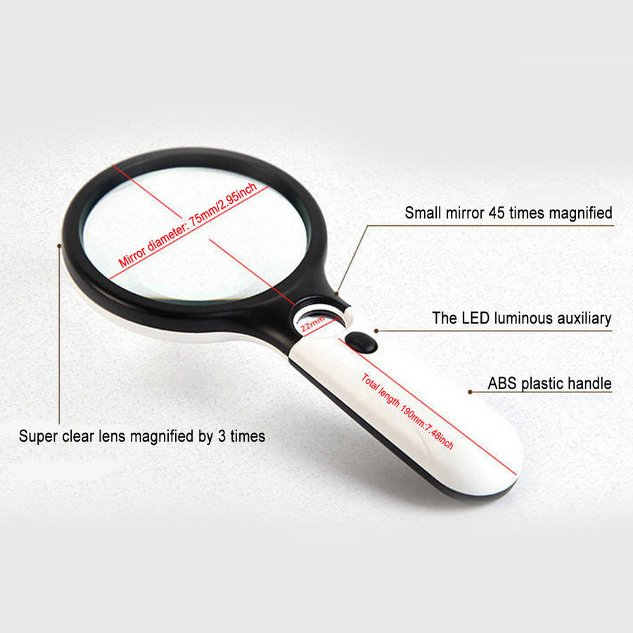 Features: - Independent lighting: ultra bright LED light ensures the best lighting effect, making text and enlarged images clearer and more accurate, suitable for reading at night. - A kind of Double lens design: magnified by 3X and 45X, it is very suitable for checking newspapers, documents, maps, coins, stamps, electronic works, jewelry, photos, handicrafts, sewing, exquisite printing in jewelry. - This magnifier is light weight and can be easily carried around. It can be opened or closed with one button. - Older people, students, arts and crafts professionals, very suitable for you to read maps, newspapers, books and magazines. - Imaginative unique LED lighting design are great to meet the requirements of elders. - The 45X lens` focal length is very short, so what our eyes see is all call inverted, reduced real image.