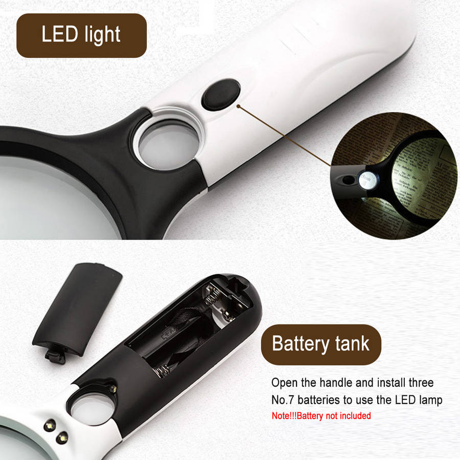 Specifications: Product Name: Double Lens With 3 LED Lights Hand Held Magnifying Glass 3X Large Lens And Small Lens 45X Material: Plastic, Glass Color: White+ Black Feature:With a button to switch on/off the LEDs Lens Diameter:7.5cm/2.95(large lens) Magnification Power:45X (small lens) & 3X (large lens) Easy To Hold Power: