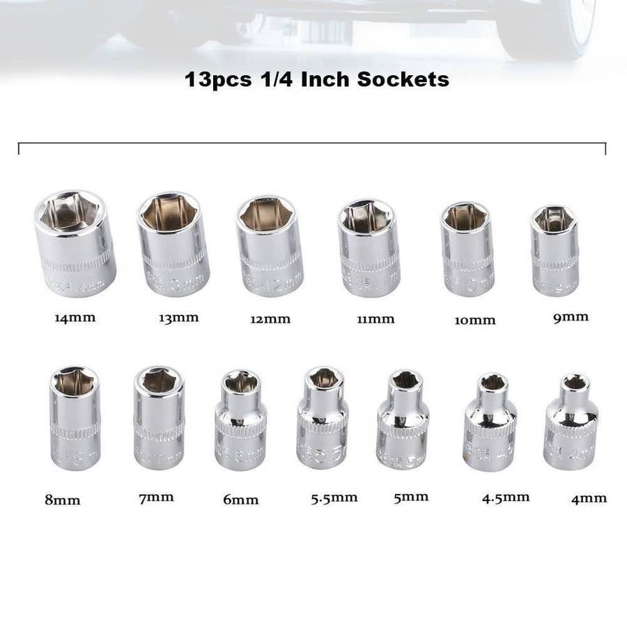 13pcs 1/4 inches DR sockets: 4, 4.5, 5, 5.5, 6, 7, 8, 9, 10, 11, 12, 13, 14mm