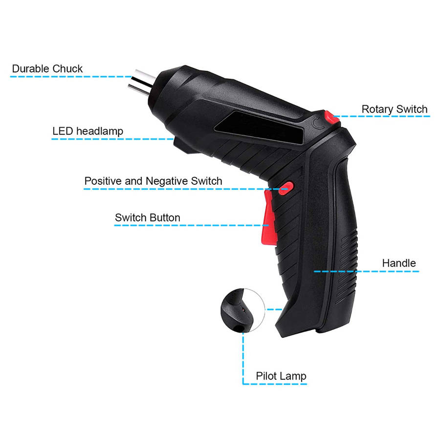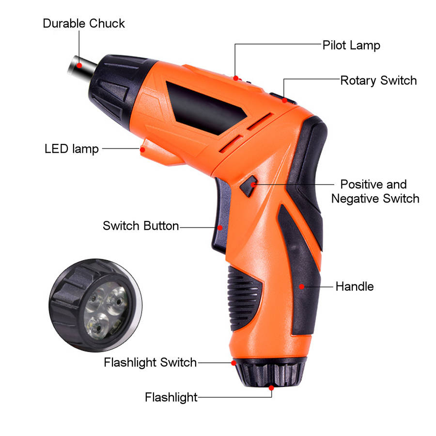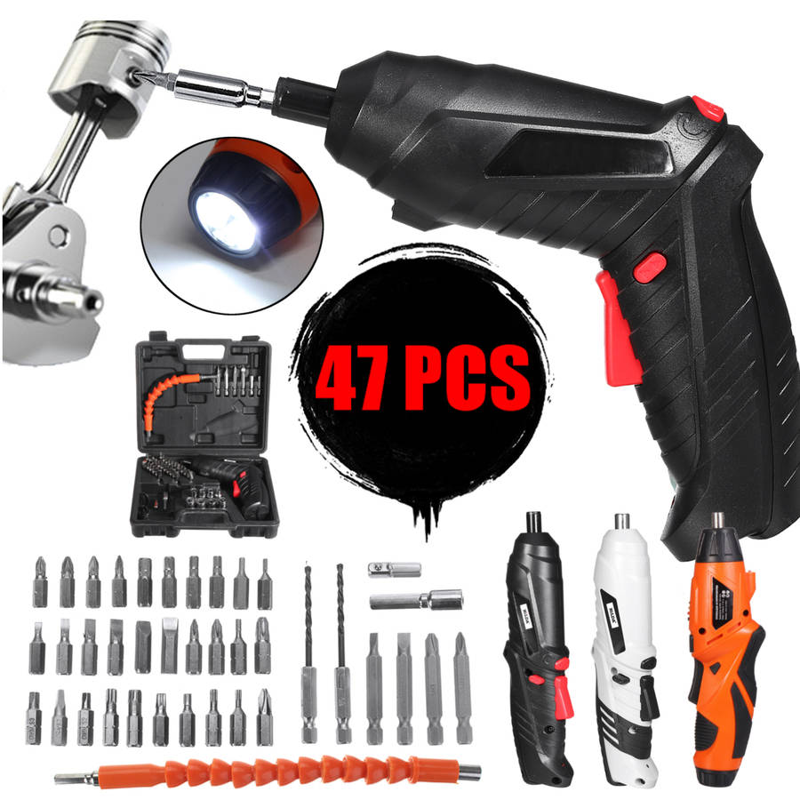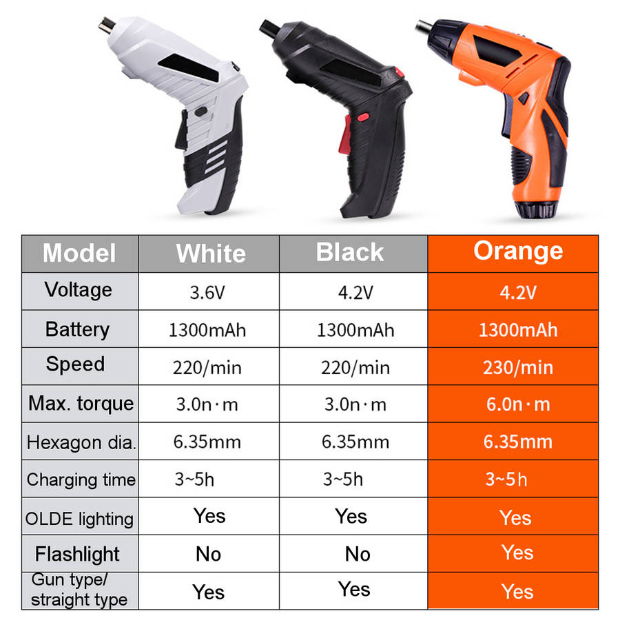 Specifications: Type(optional): 1: 4.2V Black Electric Screwdriver, 2: 3.6V White Electric Screwdriver, 3: 4.2V Orange Electric Screwdriver, 4: 47pcs Black Set, 5: 47pcs White Set, 6: 47pcs Orange Set