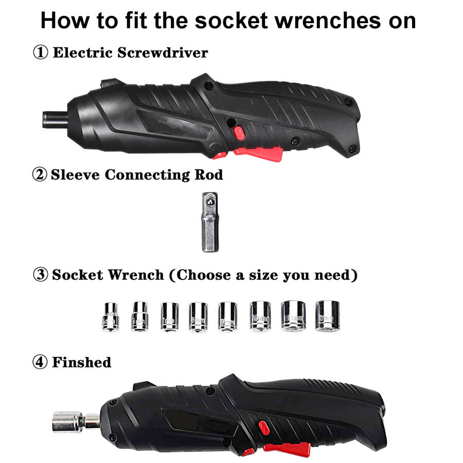 Package 4/5/6: 1 x Electric Screwdriver 1 x USB Charger Cable 1 x Flexible Hex Shaft 2 x Twist Drill Bits 8 x Socket Wrench 1 x 58mm Magnetic Extension Bar 1 x 25mm Marble Bit Holder 4 x Long Driver Bits 28 x Short Driver Bits 1 x Storage Case 1 x User Manual