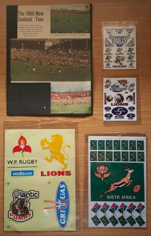 Below : Pictures of the 1965 Springbok tour to NZ glued to a scrapbook page (260mm x 340mm), provincial and Springbok rugby stickers (largest : sheet with 4 different province stickers : 300mm x 210mm).