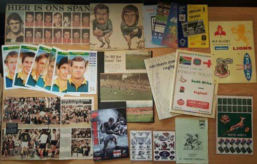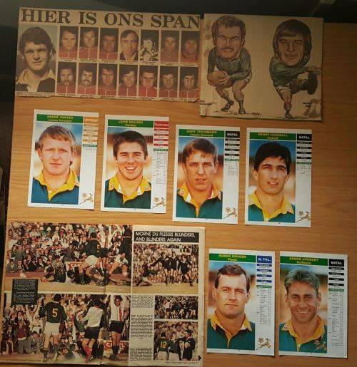 Below : Pictures of the Springbok team - 1st test vs the All Blacks 1976, newspaper drawing by Lou Henning of Piet Veldsman and Robbie Blair, pictures of 1990's Springbok players, 8 page supplement to 'Family Radio & TV' magazine with pictures of the first and second tests vs the All Blacks 1976.