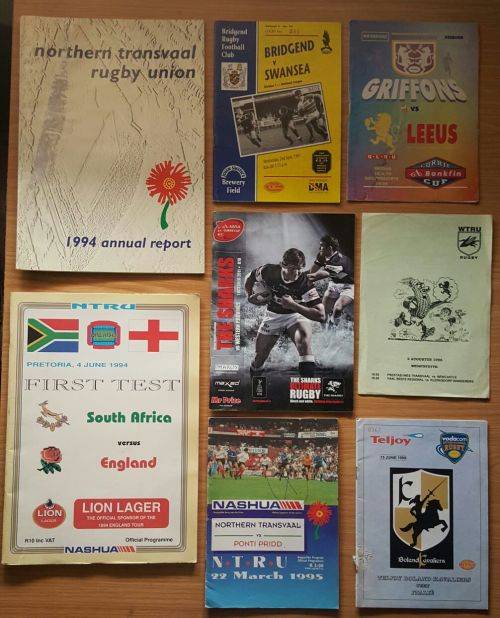 Below : 1994 Northern Transvaal annual report (32 pages) with pictures of the Northern Transvaal teams, rugby programmes : Bridgend vs Swansea 1997, Griffons vs Lions 1999, Boland Kavaliers vs Italy 1999 (slight damage to cover near spine), SA vs ENGLAND - 1st test 1994 (very good condition), Sharks vs Western Province 2011 (some creasing), Western Transvaal vs Newcastle (England club) 1996, Northern Transvaal vs Pontipridd 1995 (cross with ink pen on cover).