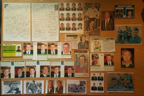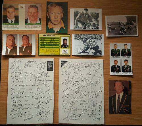 Below : pictures of 1996 Springbok rugby players. The following are postcard size : Bob Sinstad card with picture and game stats, Frik du Preez, Piet Visagie, Sakkie Sauerman, Johan Spies, Johan Claassen and Chris Koch on one postcard, Gerrie Germishuys, Willie du Plessis, Naas Botha and Divan Serfontein on one postcard. Two A4 size pages with printed autographs of former Springbok rugby players.