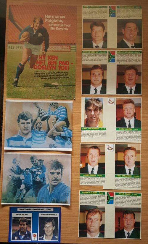 Below : Picture of former Springbok rugby player Hermanus Potgieter, pictures of 1990's Springbok rugby players, two A5 prints of drawings : Currie Cup finals - captains lifting the trophies (not high definition prints), 1989 Northern Transvaal card (postcard size) with pictures of Johan Heunis and Robert du Preez).