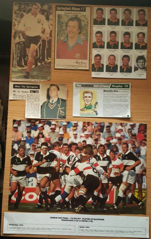 Below : Newspaper pictures of former Springbok rugby players : Klippie Kritzinger, Edrich Krantz, pictures of 12 of the Springboks who played against France - second test 1993, small photo and article on Hambley Parker from a 1965 NZ magazine, article on Mannetjies Roux from a 'Springbok 15' magazine, large picture (430mm x 260mm) and heading : 1992 Currie Cup final - Transvaal vs Natal.