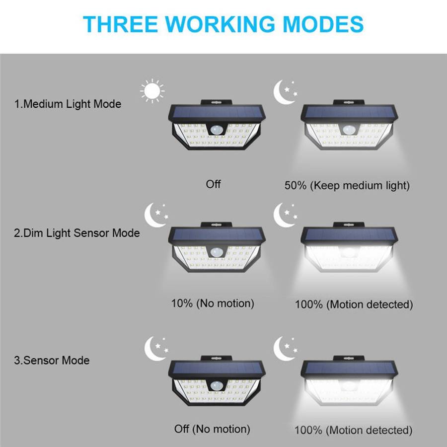 -Three Optional Modes Choose the perfect mode according to your diverse needs.Auto on at dusk and off at sunrise; dim + bright when motion detected. off + bright when motion detected.