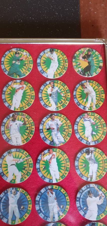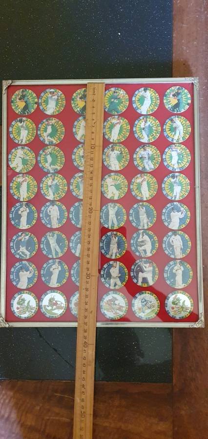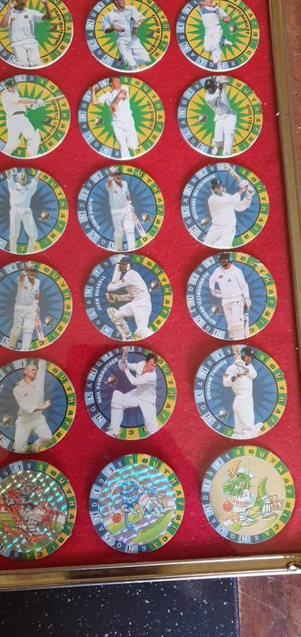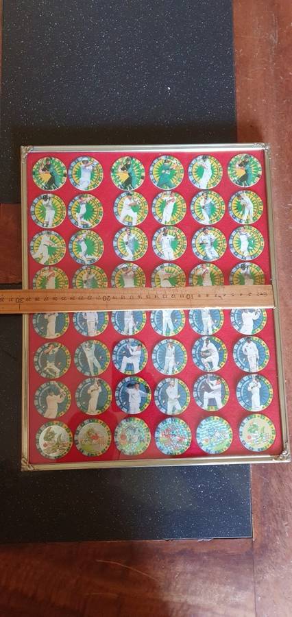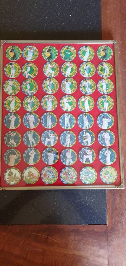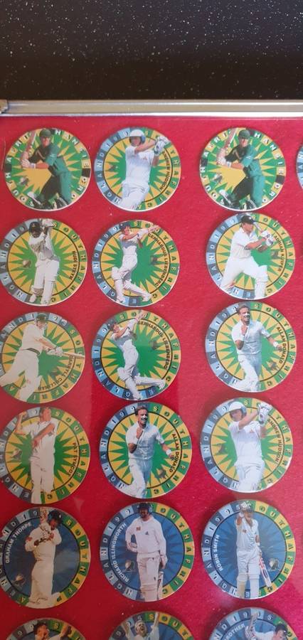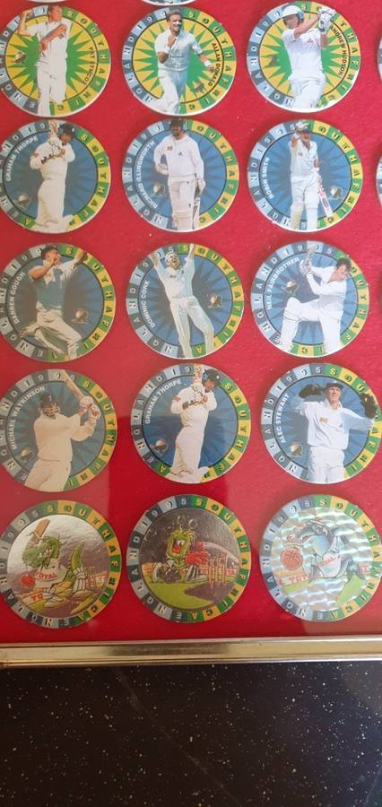 There are 48 1995 cricket tazo's framed behind glass, all in a very good condition