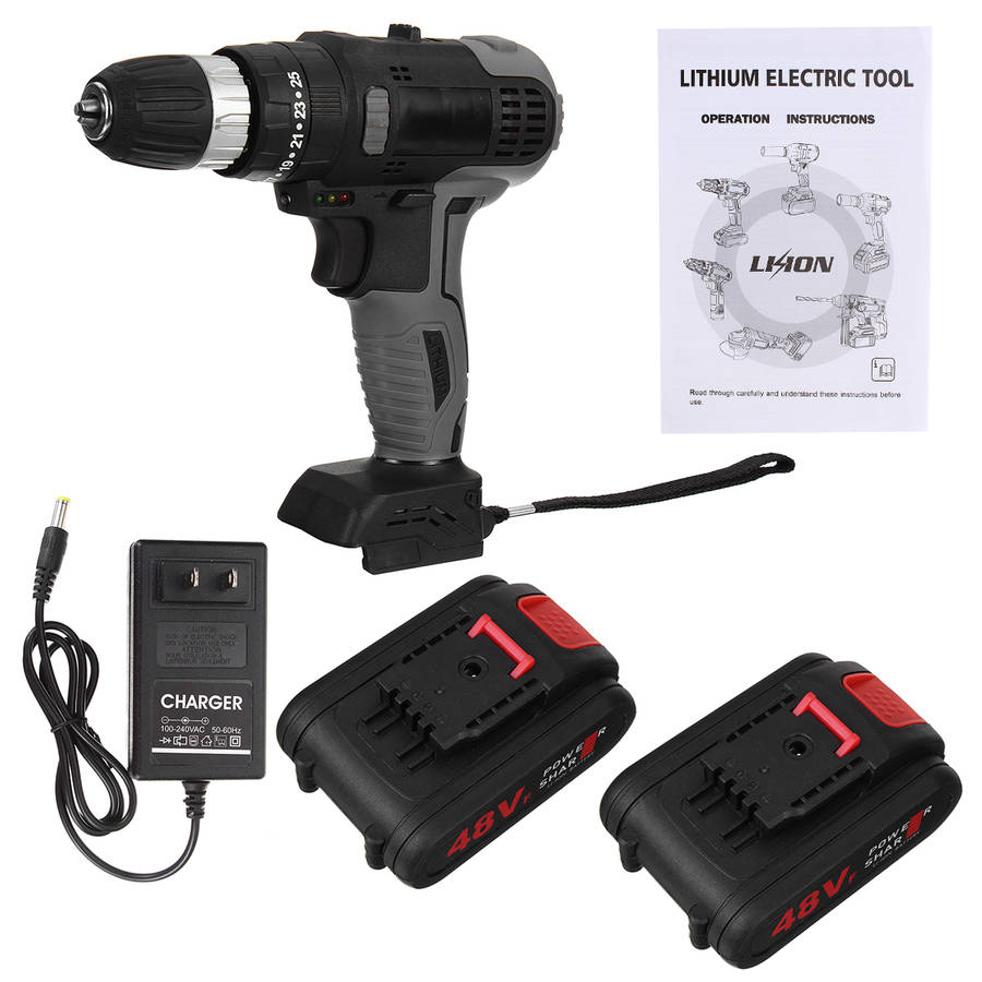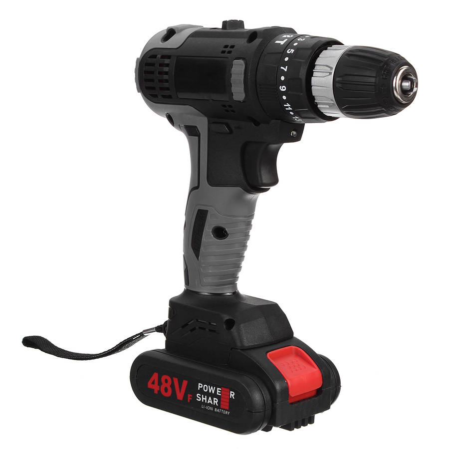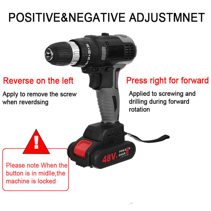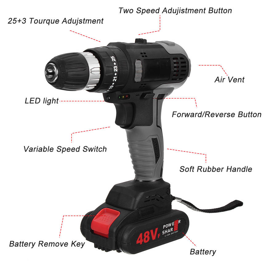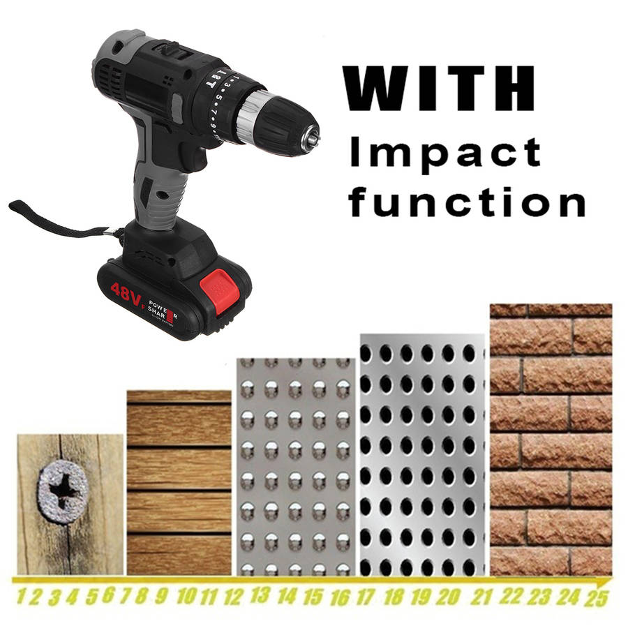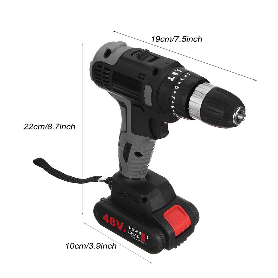 Specifications Name: Electric Drill ColorBlack+Gray Appearance size: 19*22*10cm/7.5*8.7*3.9inch Battery Voltage: 48VUS Plug Max Torque: 25-28Nm No Load Speed: 0-450r/min, 0-1450r/min